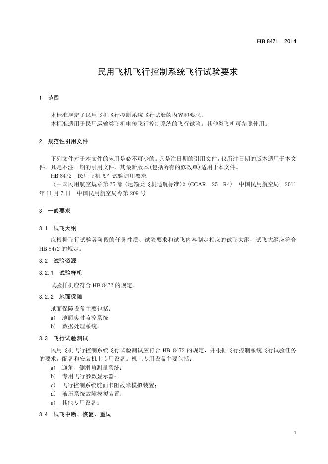 HB 8471-2014(2017) 民用飞机飞行控制系统飞行试验要求