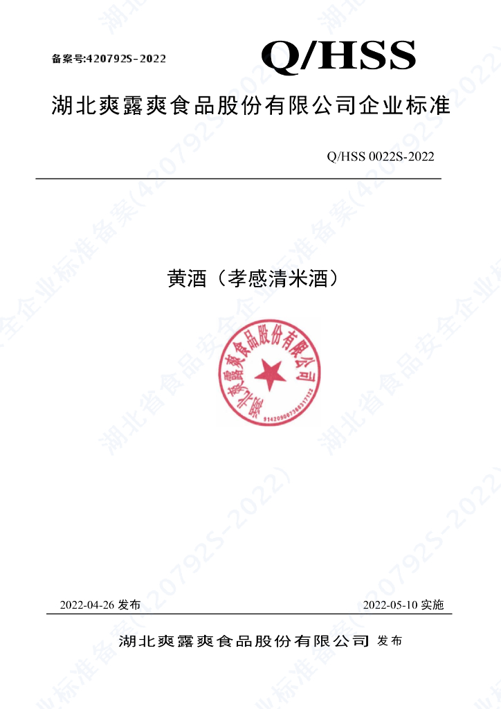 Q/HSS 0022S-2022 黄酒(孝感清米酒)