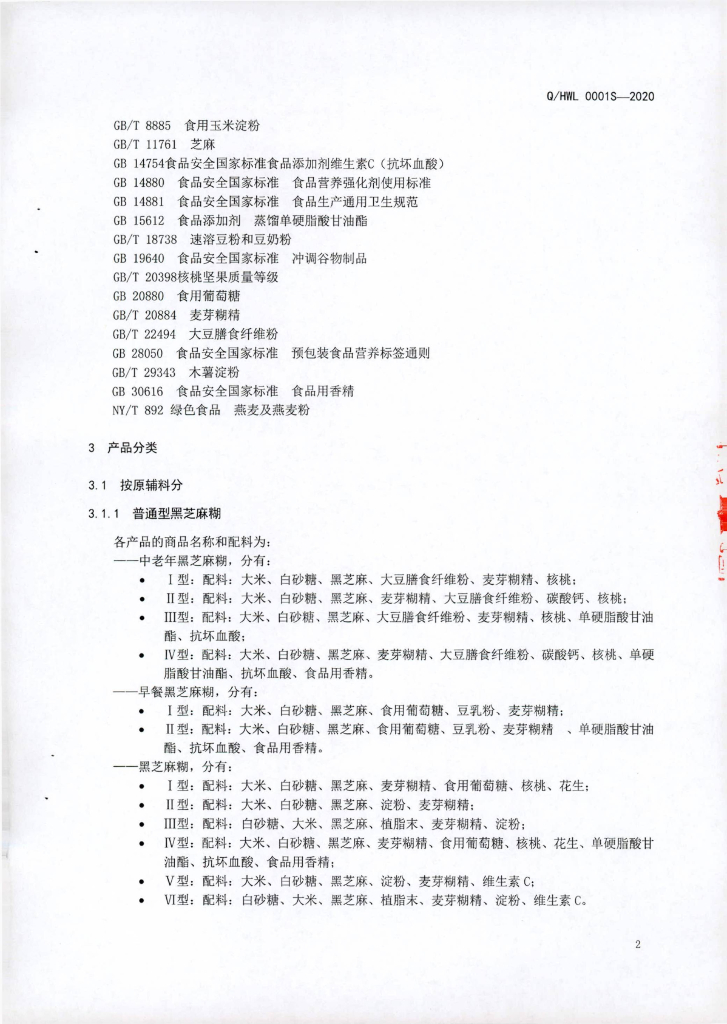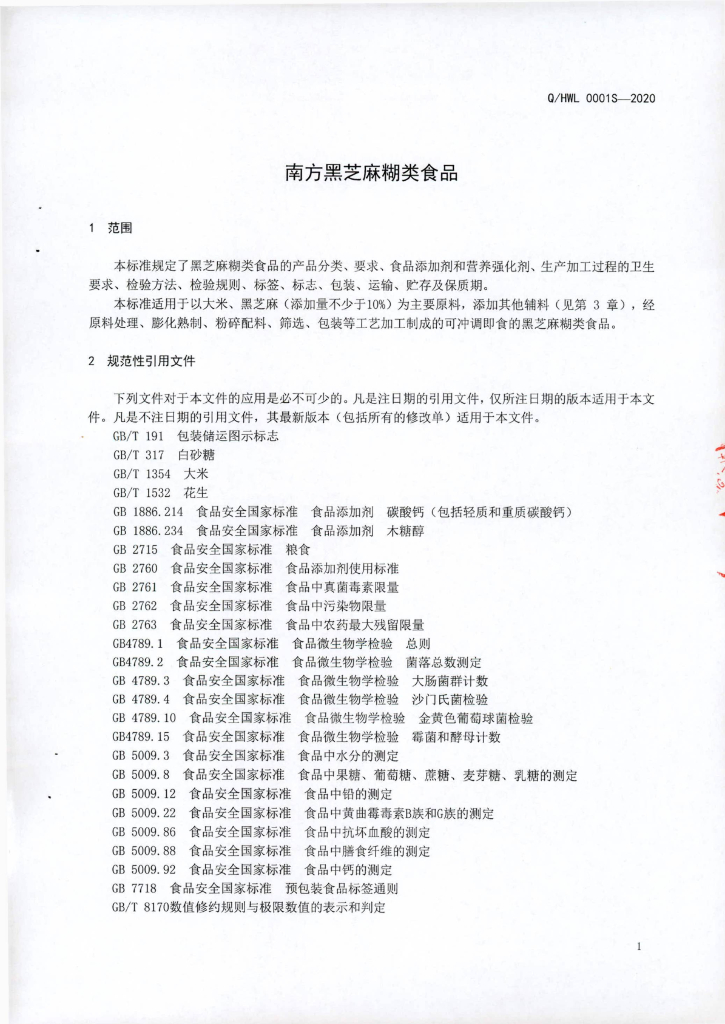 Q/HWL 0001S-2020 南方黑芝麻糊类食品