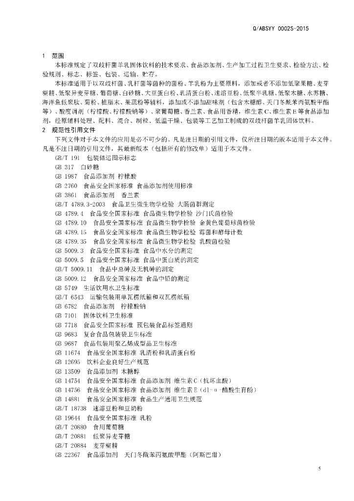 Q/ABSYY 002S-2015 山东奥博森医药科技有限公司 双歧杆菌羊乳固体饮料
