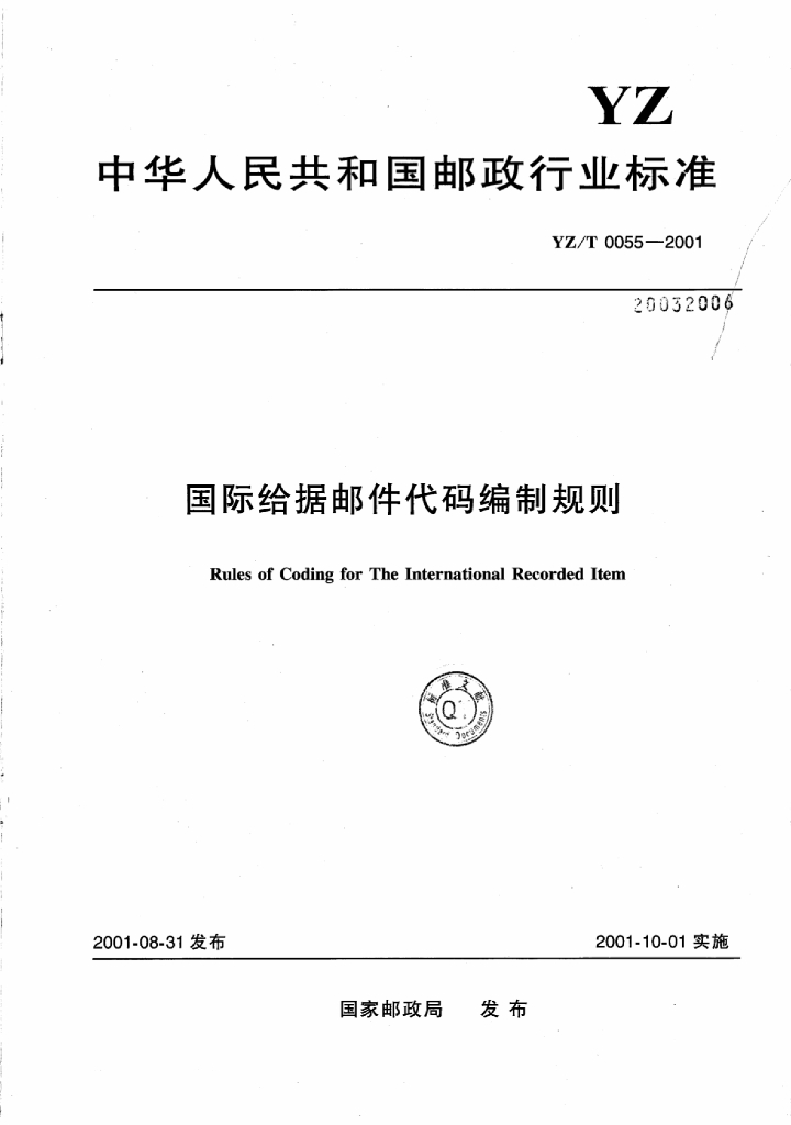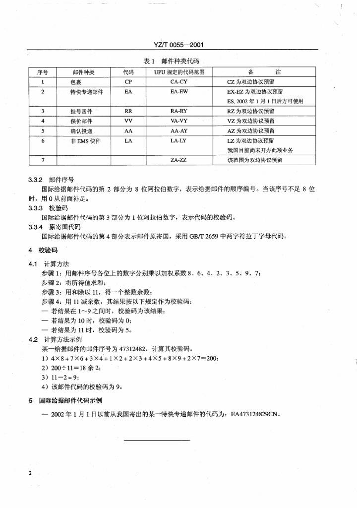 YZ/T 0055-2001 国际给据邮件代码编制规则