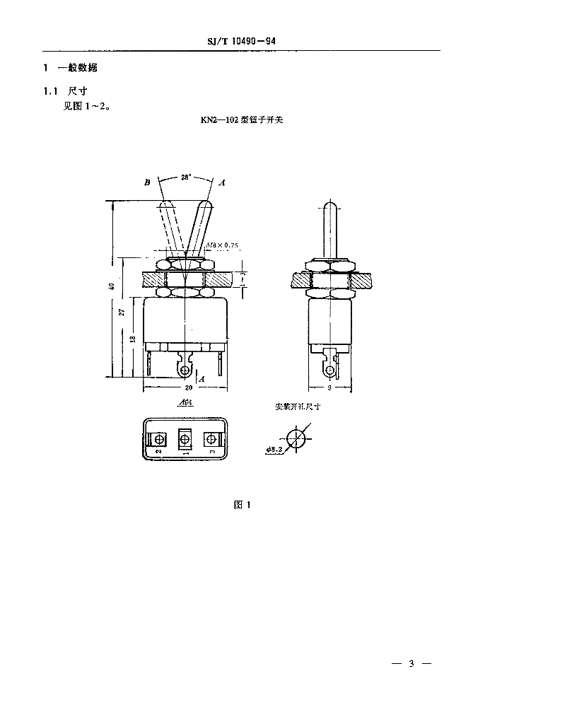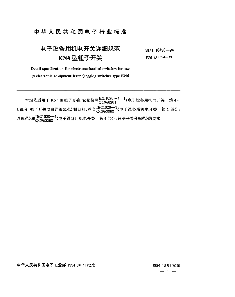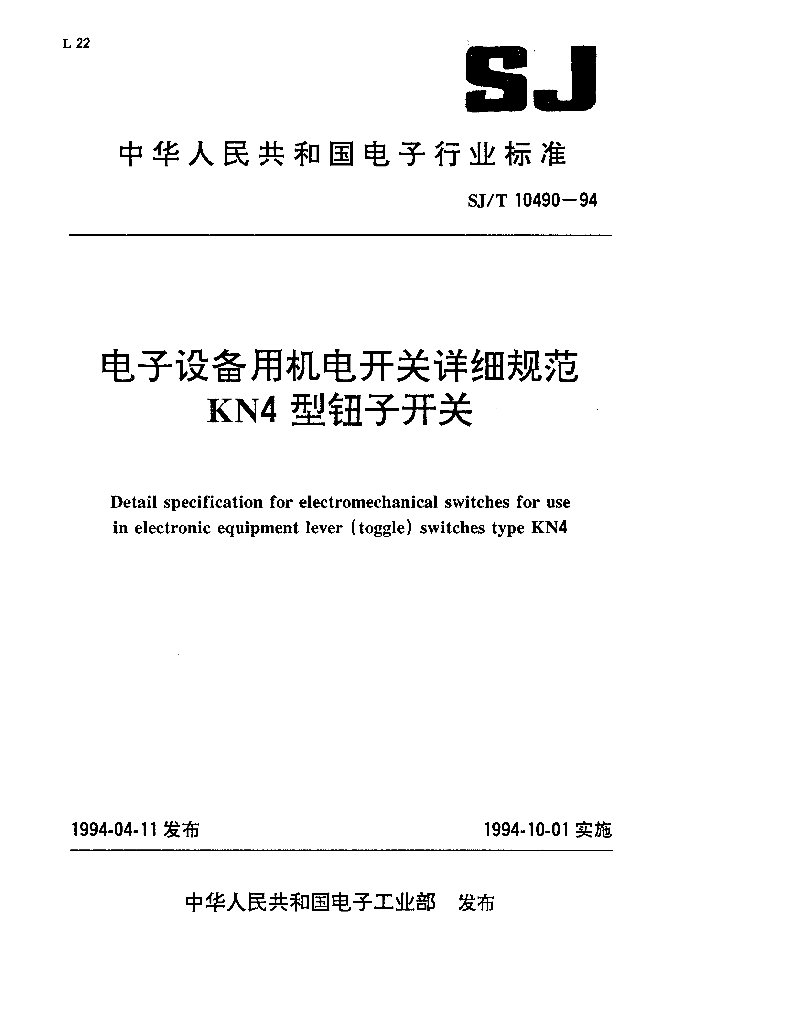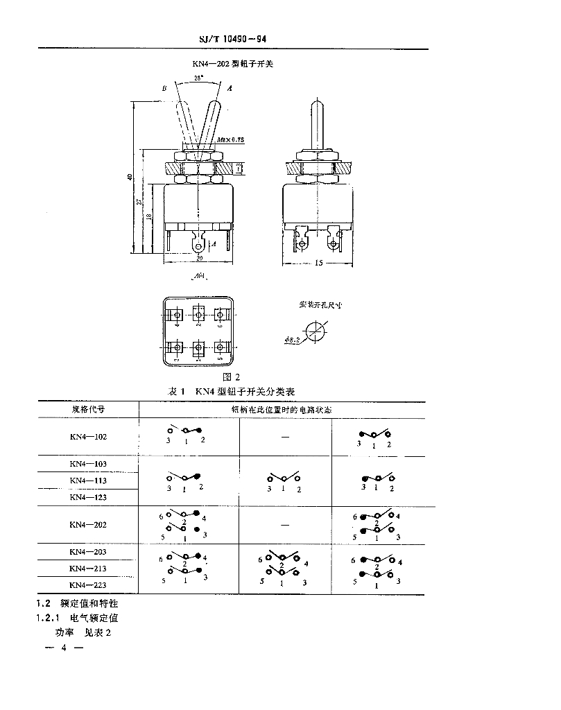 SJ/T 10490-1994 电子设备用机电开关详细规范 KN4型钮子开关