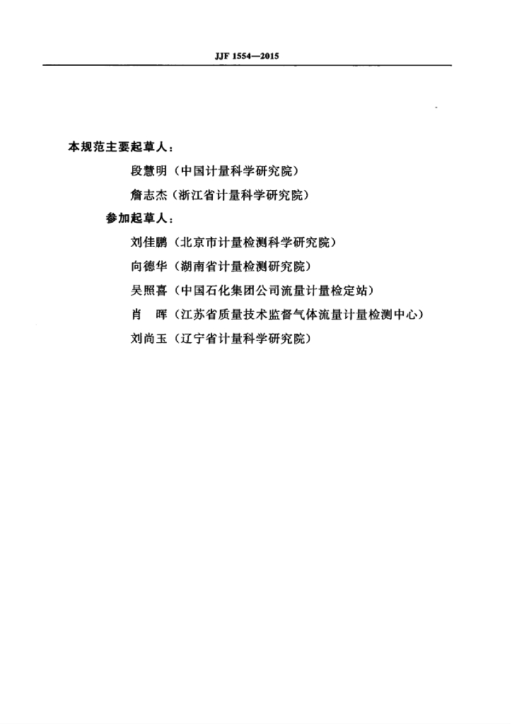 段慧明(中国计量科学研究院)、詹志杰(浙江省计量科学研究院)、刘佳鹏(北京市计量检测科学研究院)、向德华(湖南省计量检测研究院)、吴照喜(中国石化集团公司流量计量检定站)、肖晖(江苏省质量技术监督气体流量计量检测中心)、刘尚玉(辽宁省计量科学研究院)