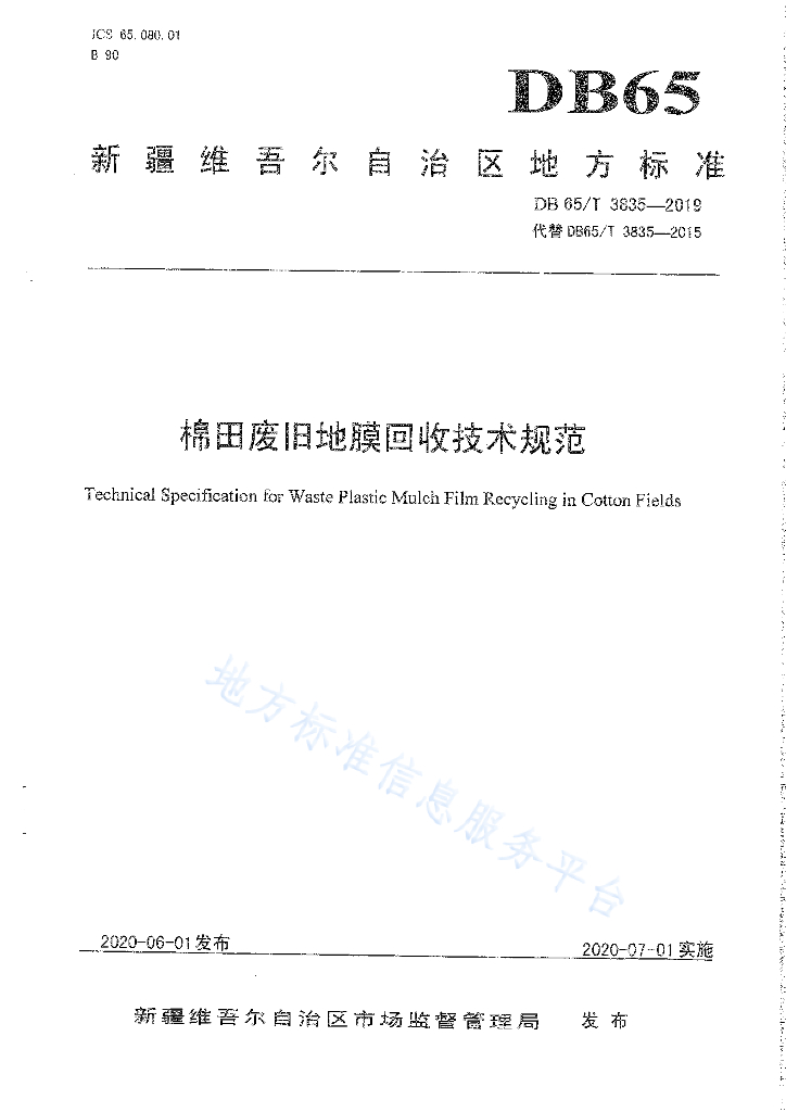 DB65/T 3835-2019 棉田废旧地膜回收技术规范