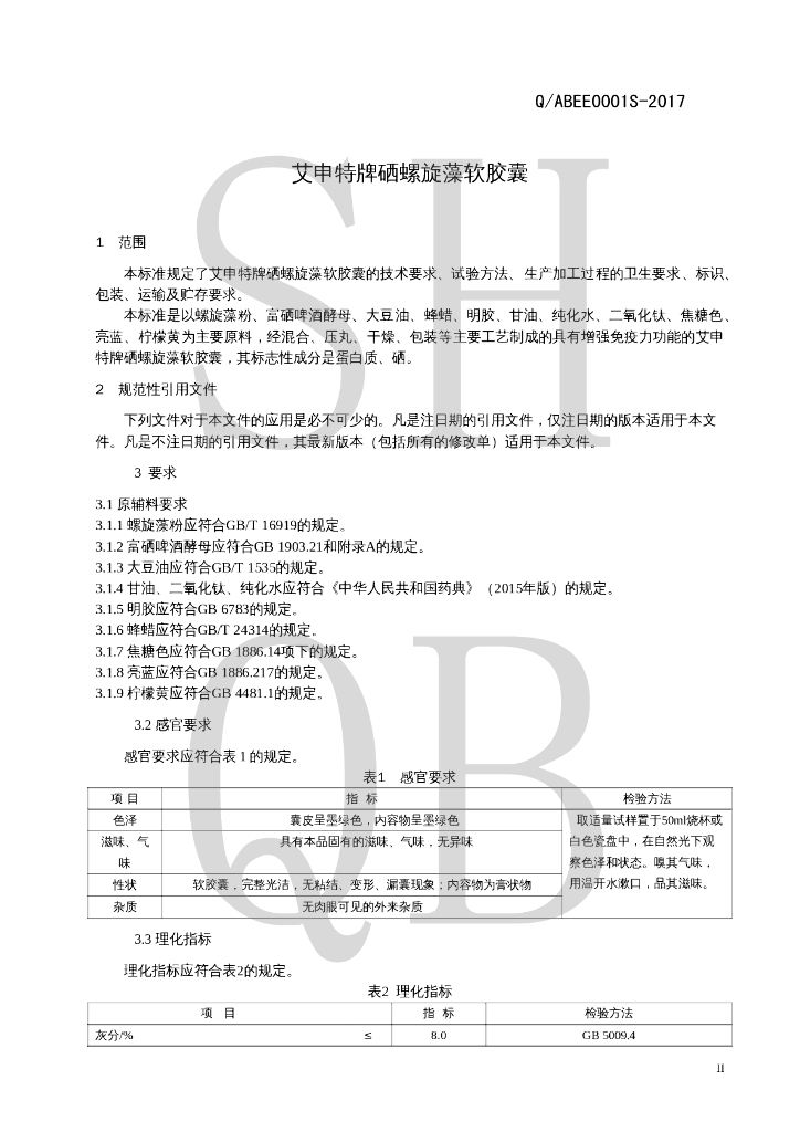 Q/ABEE 0001S-2017 艾申特牌硒螺旋藻软胶囊