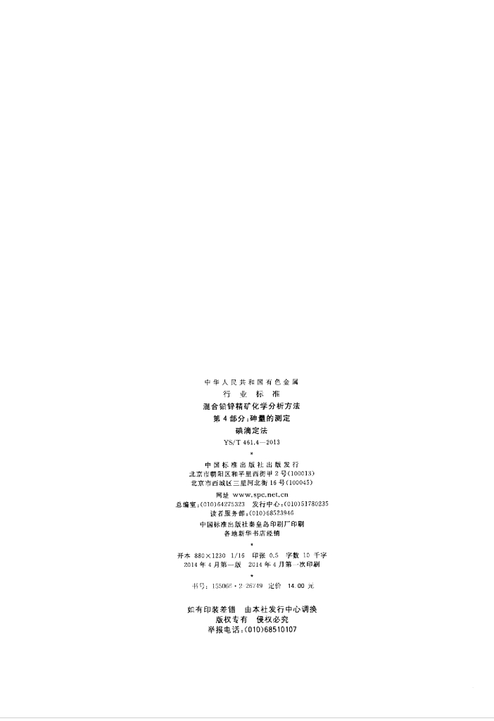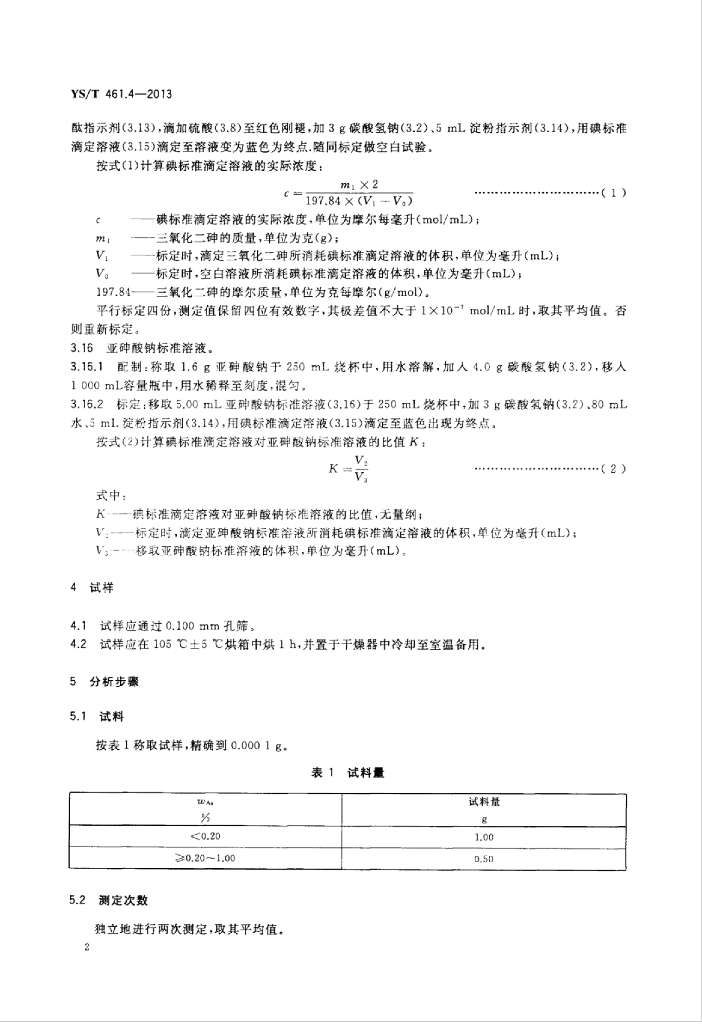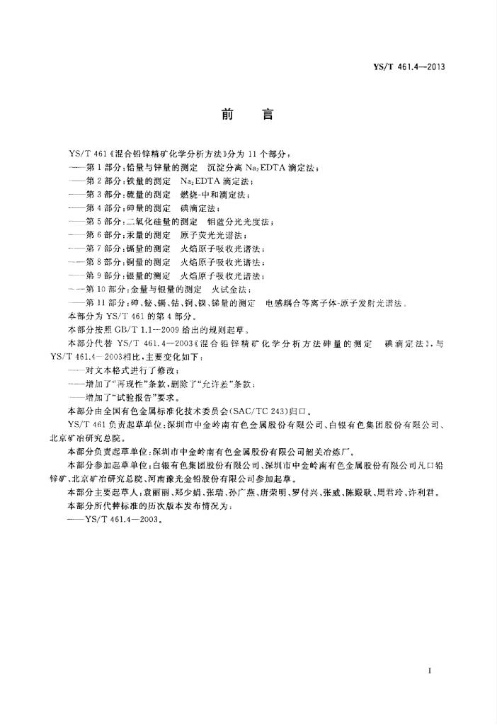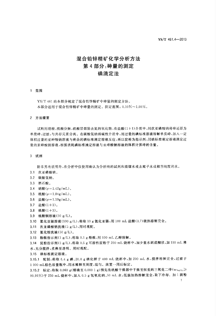 YS/T 461.4-2013 混合铅锌精矿化学分析方法 第4部分:砷量的测定碘滴定法