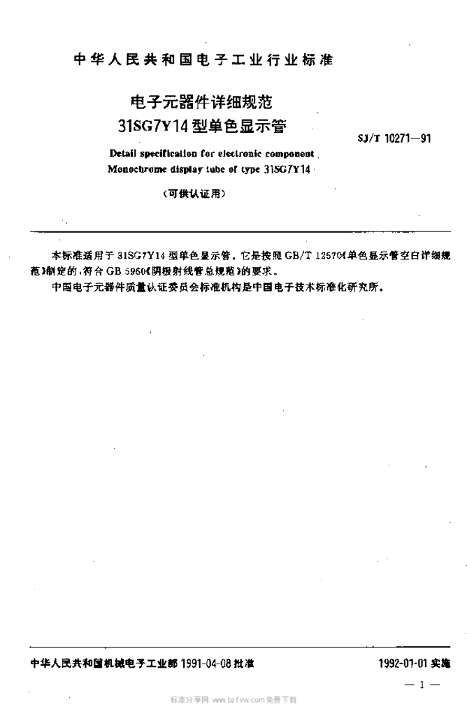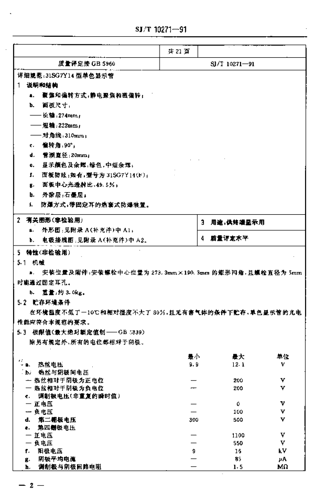 SJ/T 10271-1991 电子元器件详细规范31SG7Y14型单色显示管