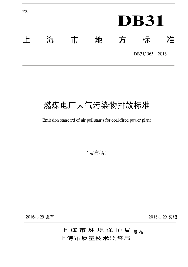 DB31/ 963-2016 燃煤电厂大气污染物排放标准