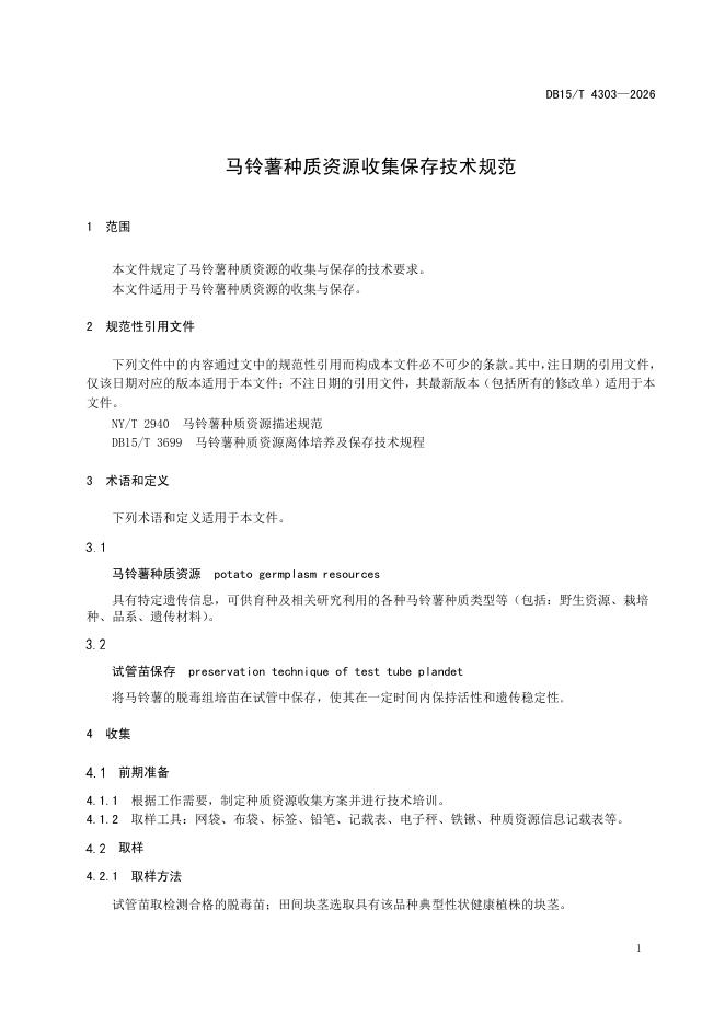 DB15/T 4303-2026 马铃薯种质资源收集保存技术规范