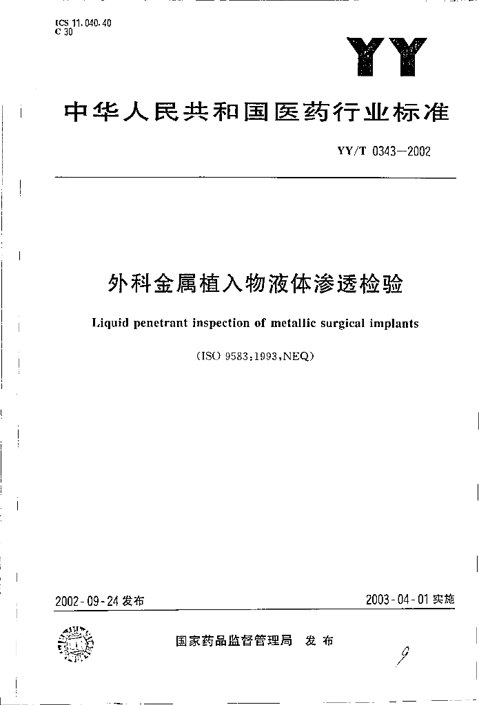 YY/T 0343-2002 外科金属植入物液体渗透检验