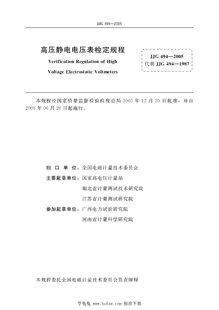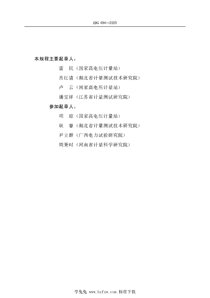 雷民(国家高电压计量站)、肖红清(湖北省计量测试技术研究院)、卢云(国家高电压计量站)、潘宝祥(江苏省计量测试研究院)、项琼(国家高电压计量站)、耿睿(湖北省计量测试技术研究院)、尹立群(广西电力试验研究院)、周秉时(河南省计量科学研究院)