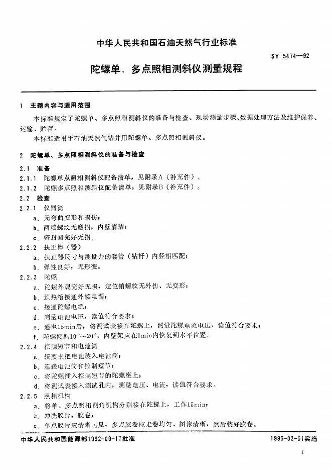 SY 5474-1992 陀螺单、多点照相测斜仪测量规程