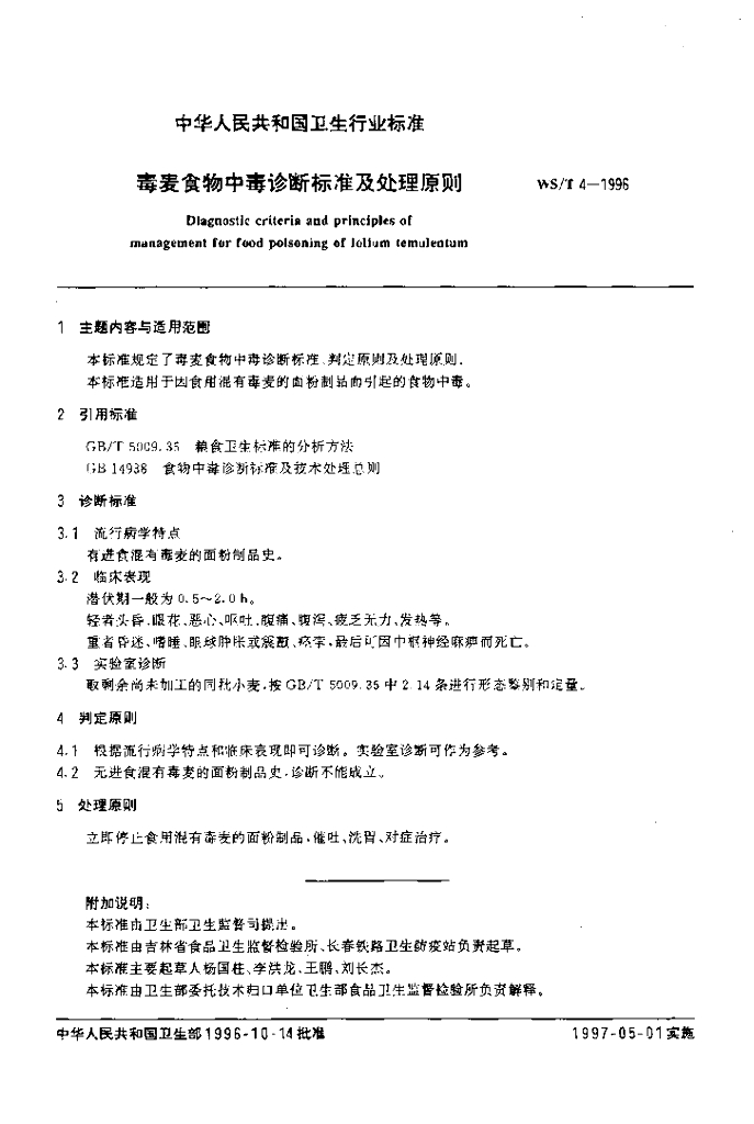 WS/T 4-1996 毒麦食物中毒诊断标准及处理原则