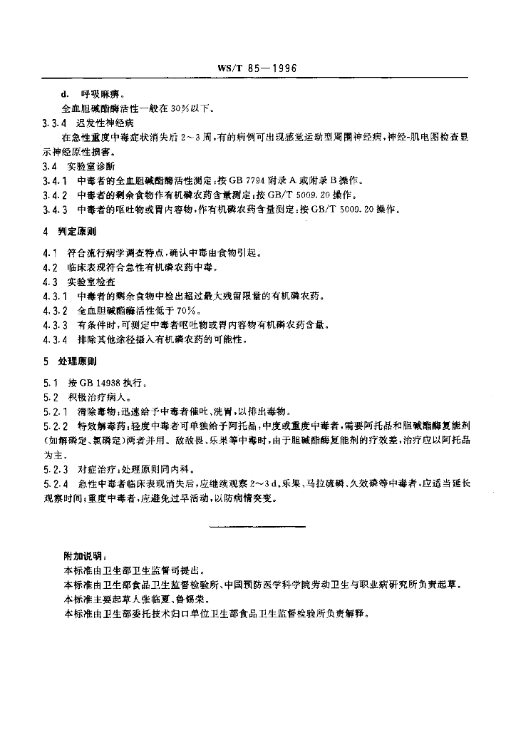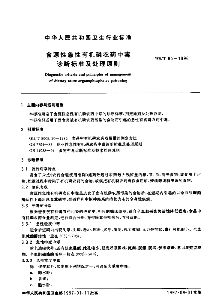 WS/T 85-1996 食源性急性有机磷农药中毒诊断标准及处理原则