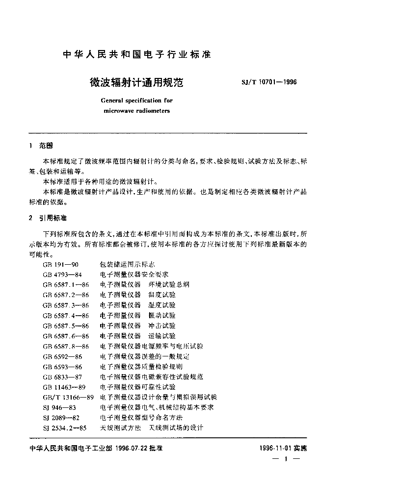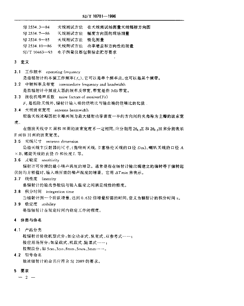 SJ/T 10701-1996 微波辐射计通用规范