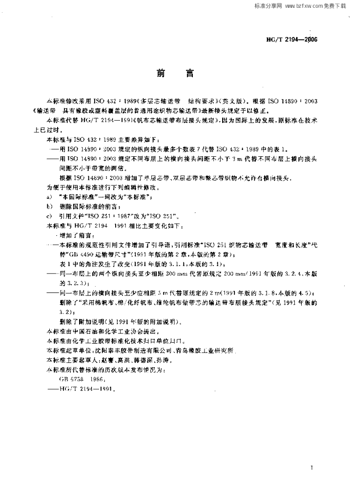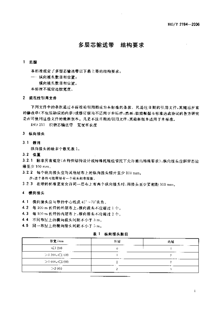 HG/T 2194-2006 多层芯输送带 结构要求