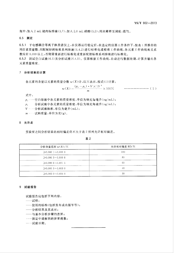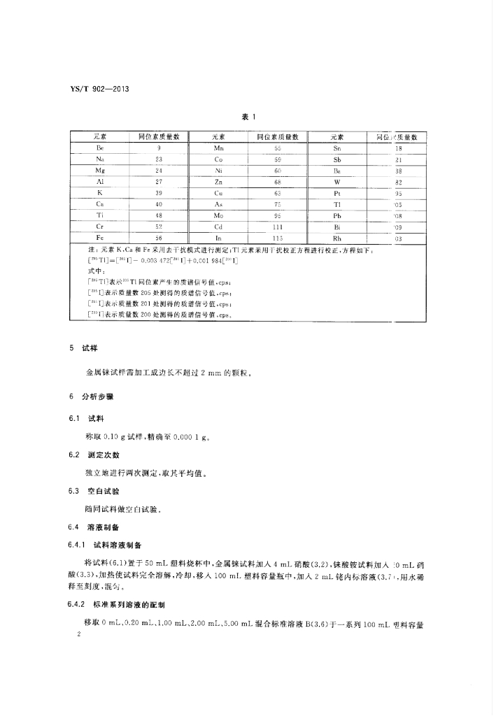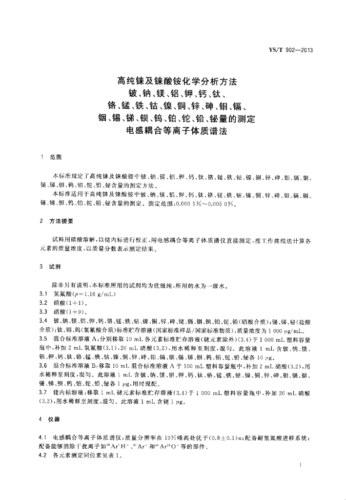 YS/T 902-2013 高纯铼及铼酸铵化学分析方法铍、钠、镁、铝、钾、钙、钛、铬、锰、铁、钴、镍、铜、锌、砷、钼、镉、铟、锡、锑、钡、钨、铂、铊、铅、铋量的测定电感耦合等离子体质谱法
