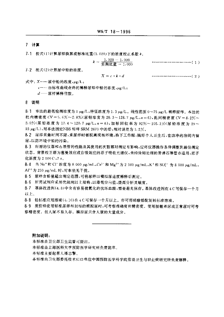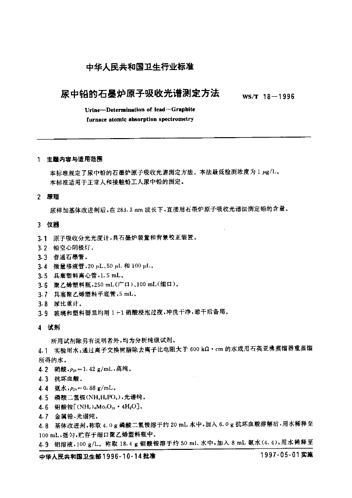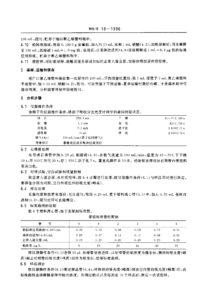 WS/T 18-1996 尿中铅的石墨炉原子吸收光谱测定方法
