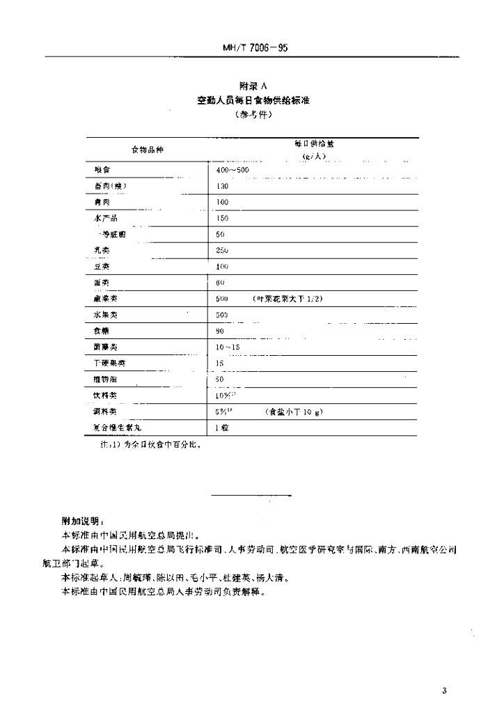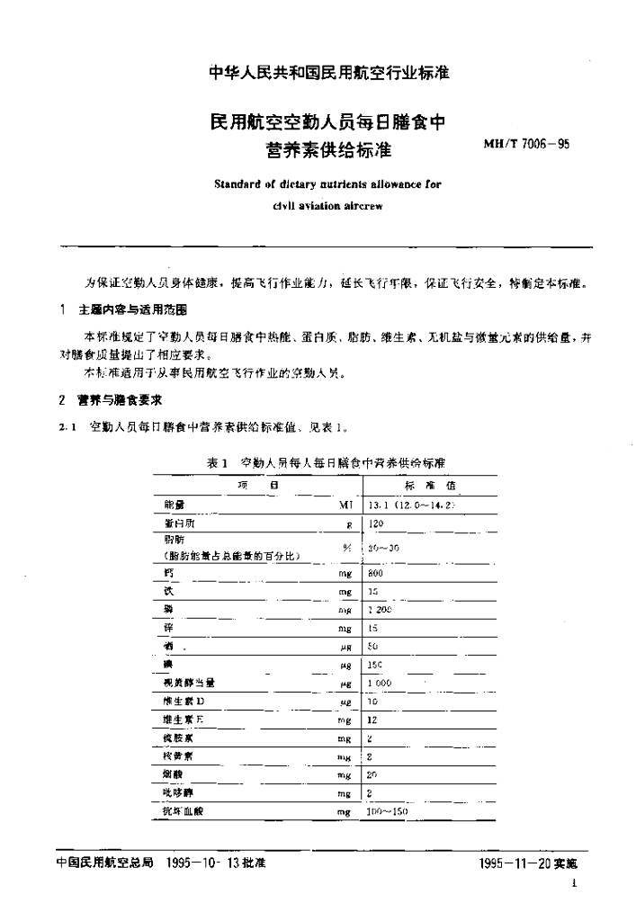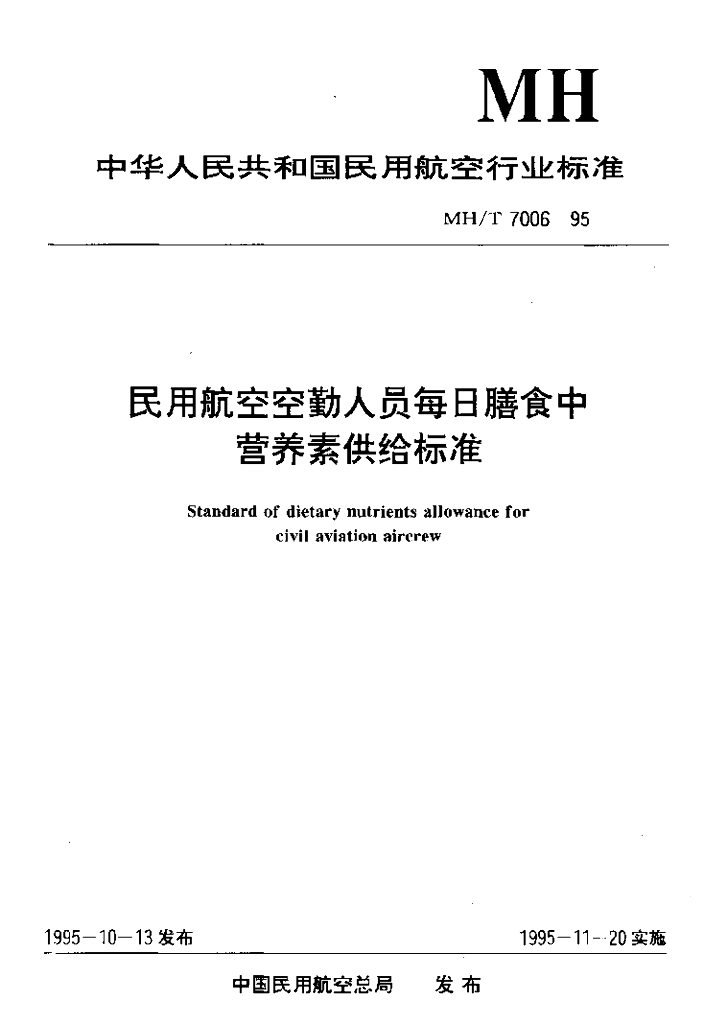 MH/T 7006-1995 民用航空空勤人员每日膳食中营养素供给标准
