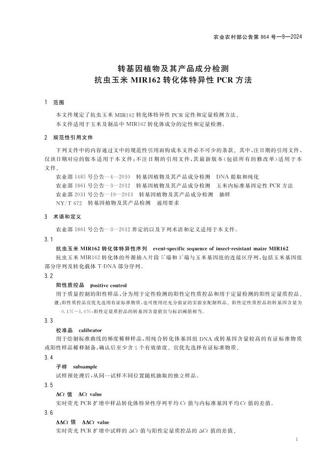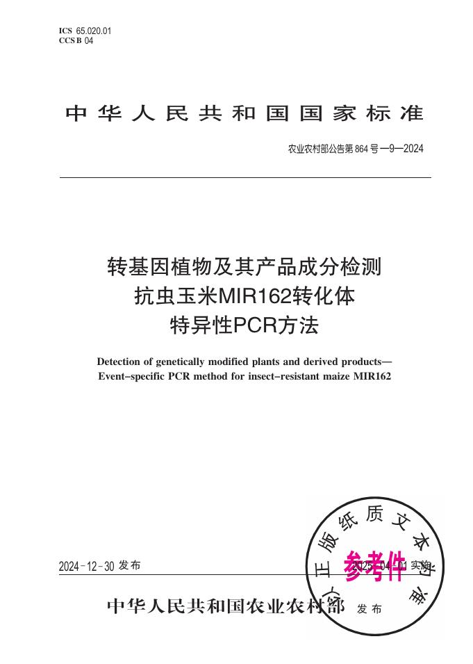 农业农村部公告 第864号-9-2024 转基因植物及其产品成分检测 抗虫玉米MIR162转化体特异性PCR方法