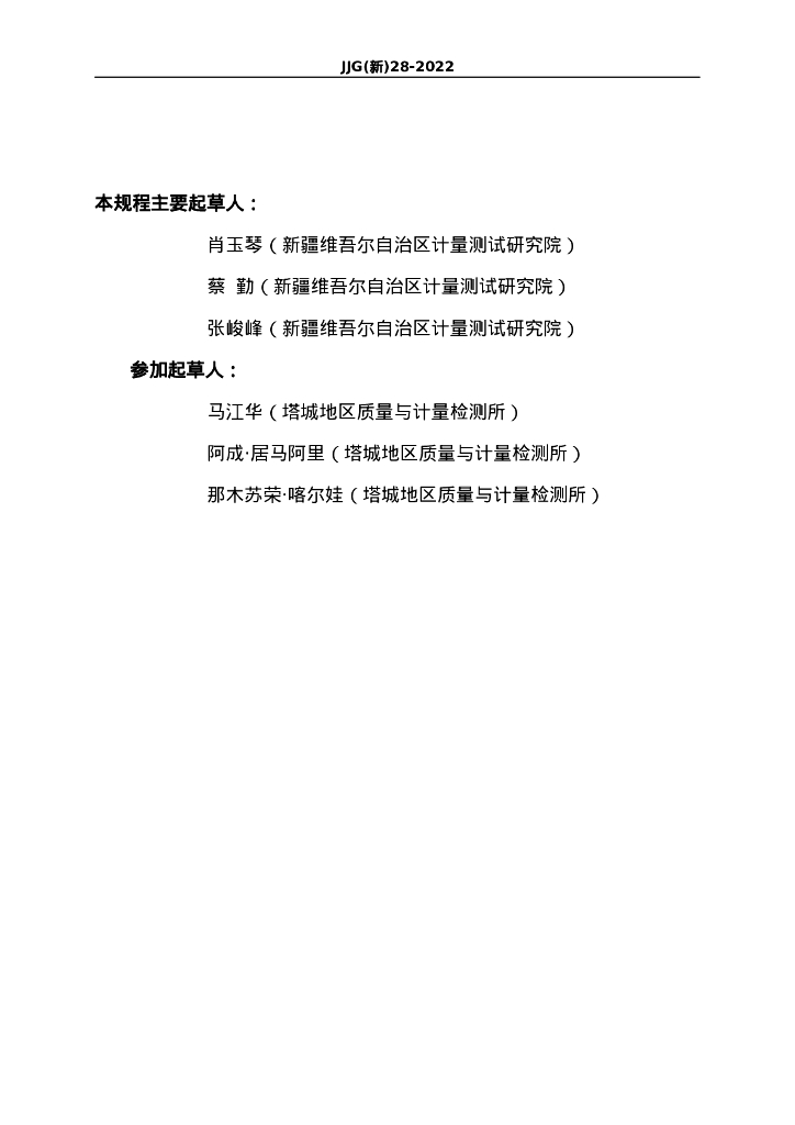 肖玉琴(新疆维吾尔自治区计量测试研究院)、蔡勤(新疆维吾尔自治区计量测试研究院)、张峻峰(新疆维吾尔自治区计量测试研究院)、马江华(塔城地区质量与计量检测所)、阿成·居马阿里(塔城地区质量与计量检测所)、那木苏荣·喀尔娃(塔城地区质量与计量检测所)