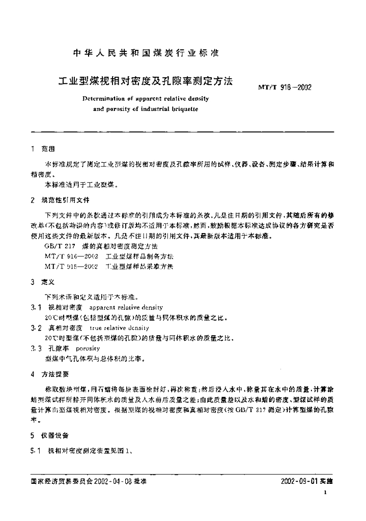 MT/T 918-2002 工业型煤视相对密度及孔隙率测定方法