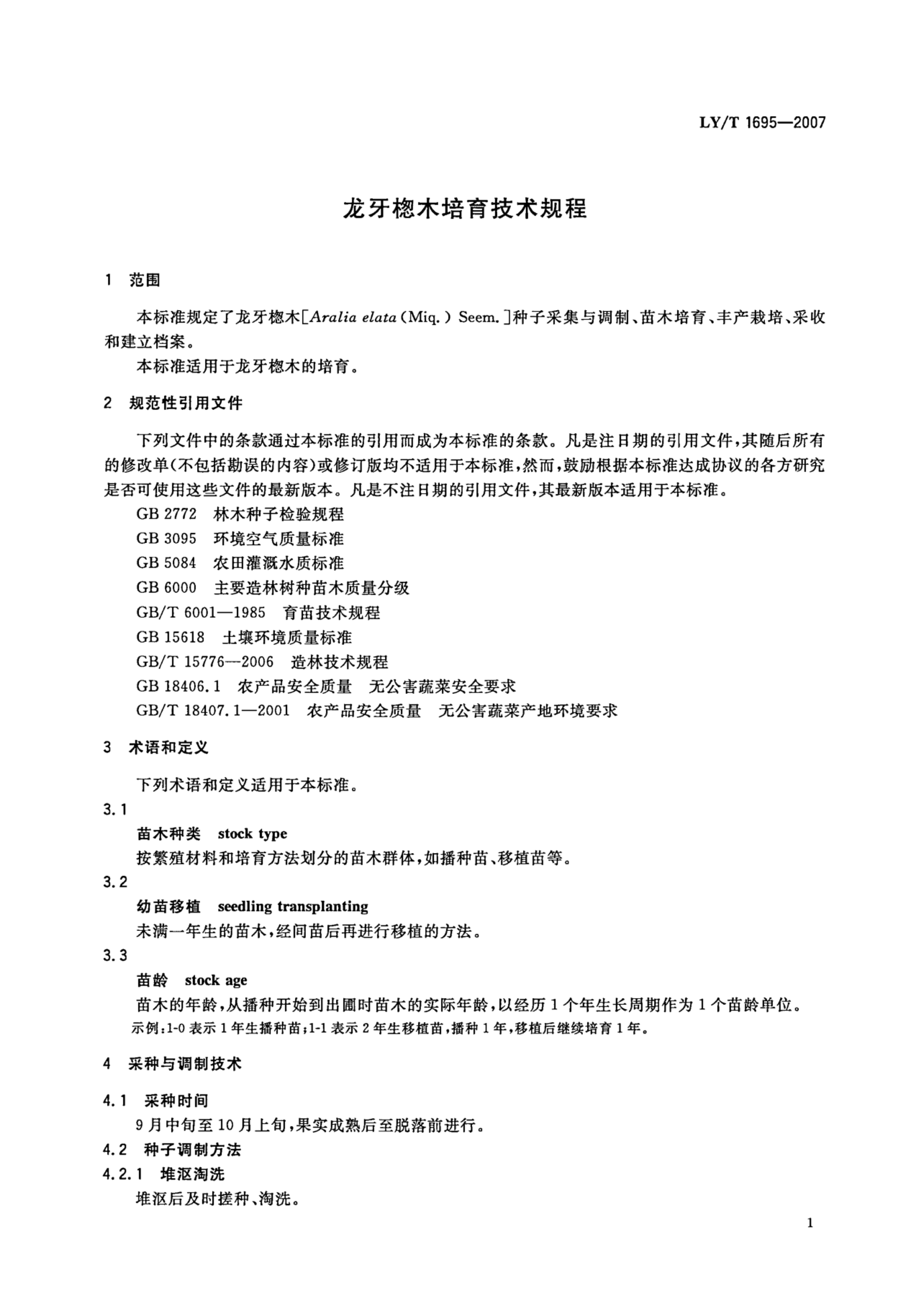 LY/T 1695-2007 龙牙楤木培育技术规程