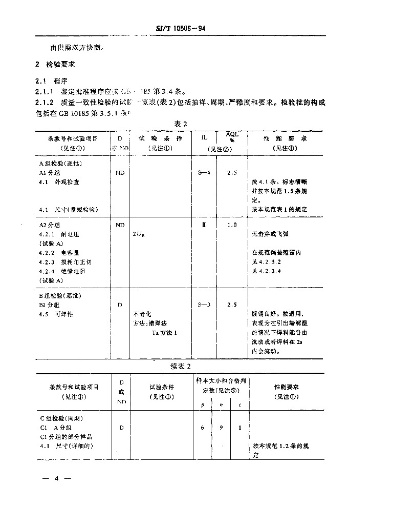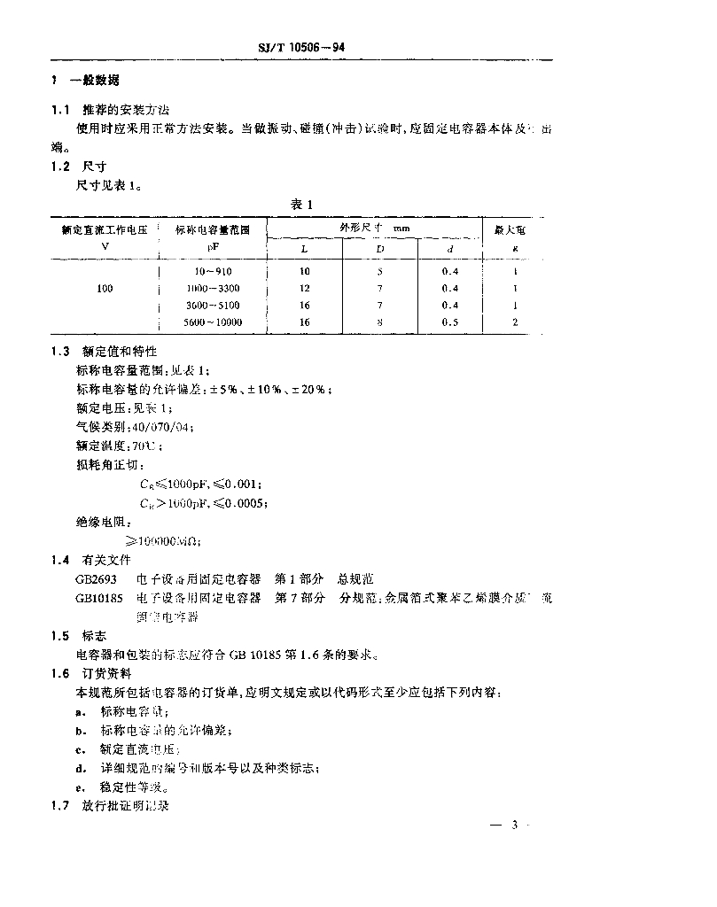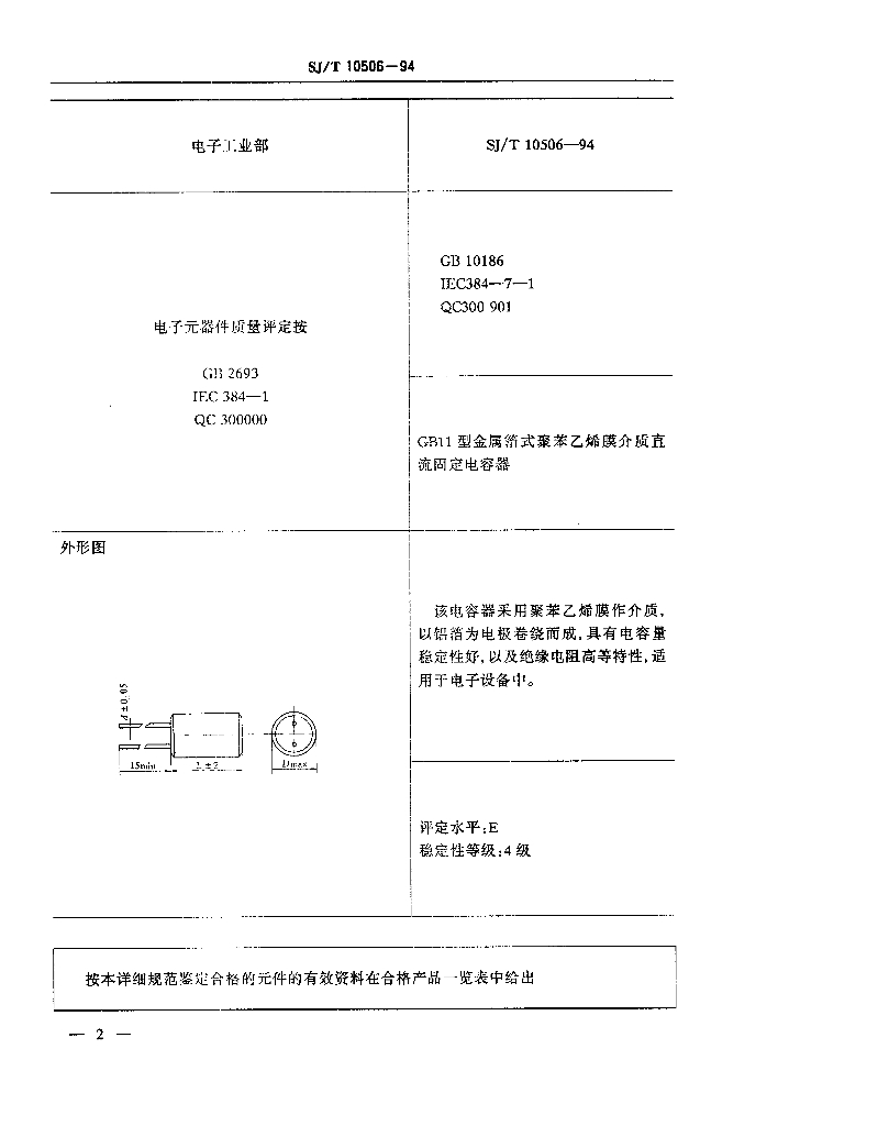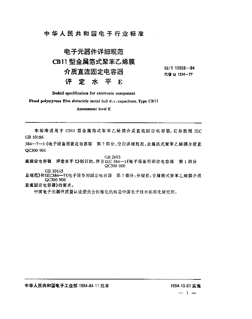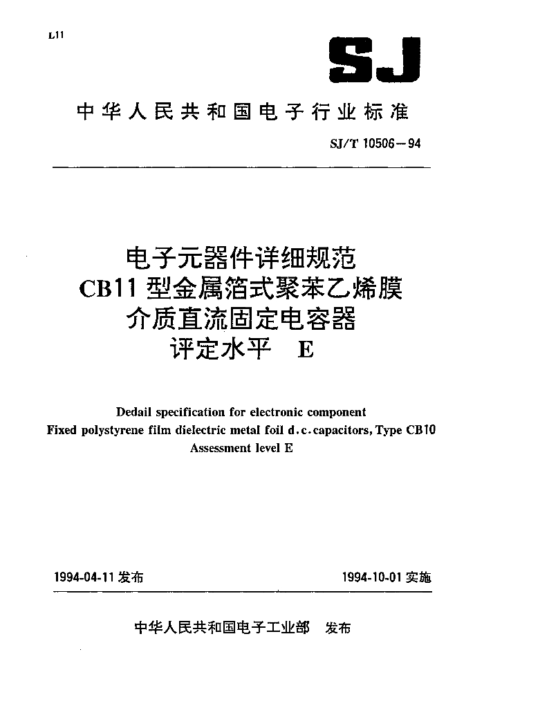 SJ/T 10506-1994 电子元器件详细规范 CB11型金属箔式聚苯乙烯膜介质直流固定电容器 评定水平E