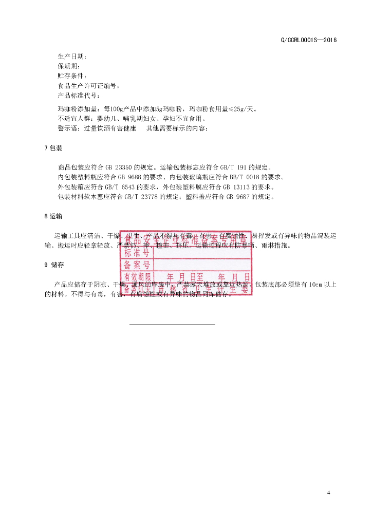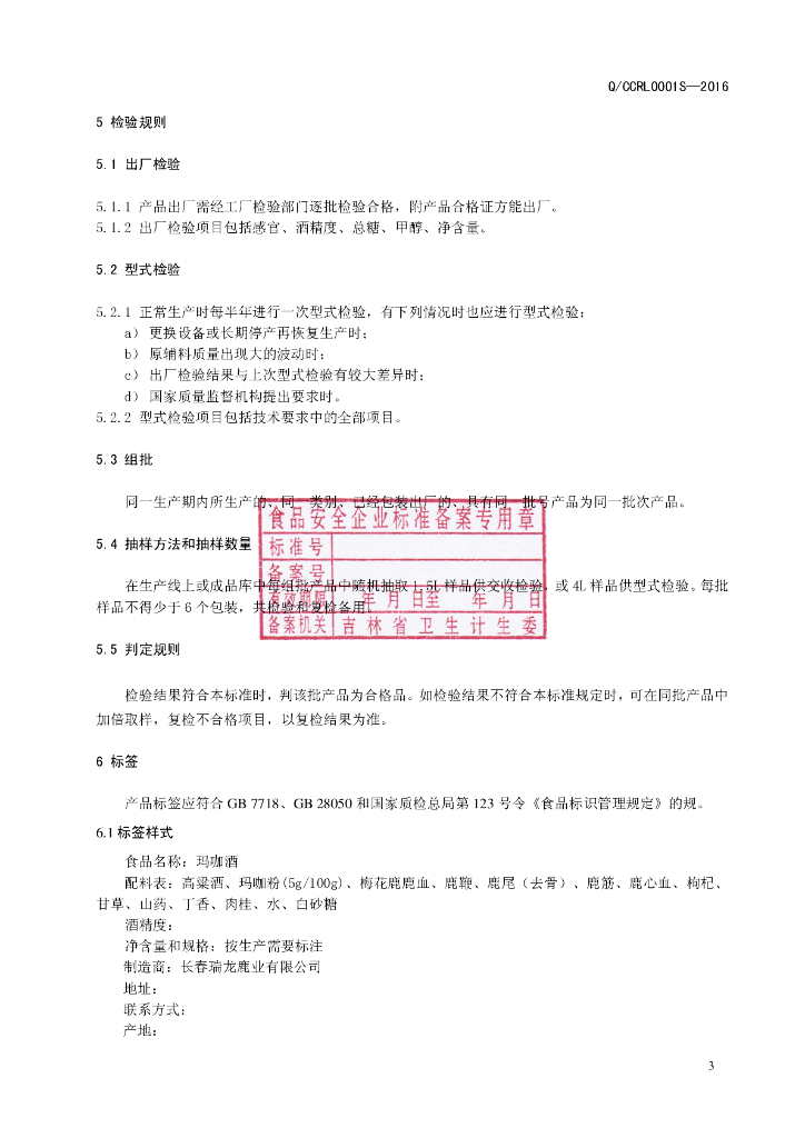 Q/CCRL 0006S-2016 长春瑞龙鹿业有限公司 玛咖酒