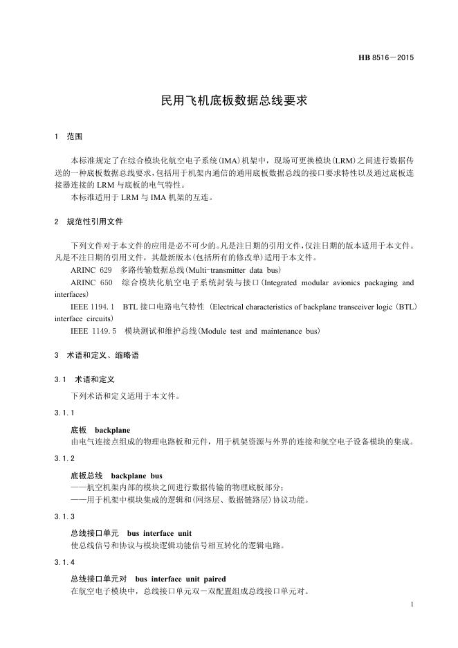 HB 8516-2015 民用飞机底板数据总线要求(2017)