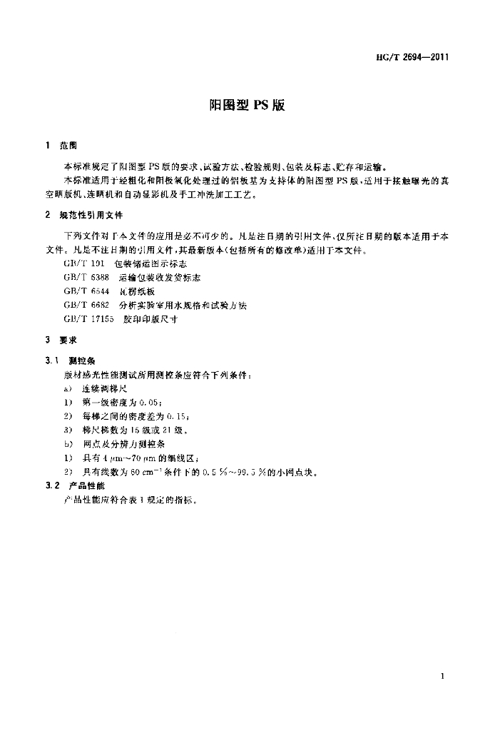 HG/T 2694-2011 代替 HG/T 2694-2003 阳图型 PS 版