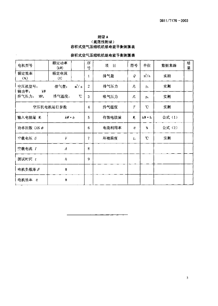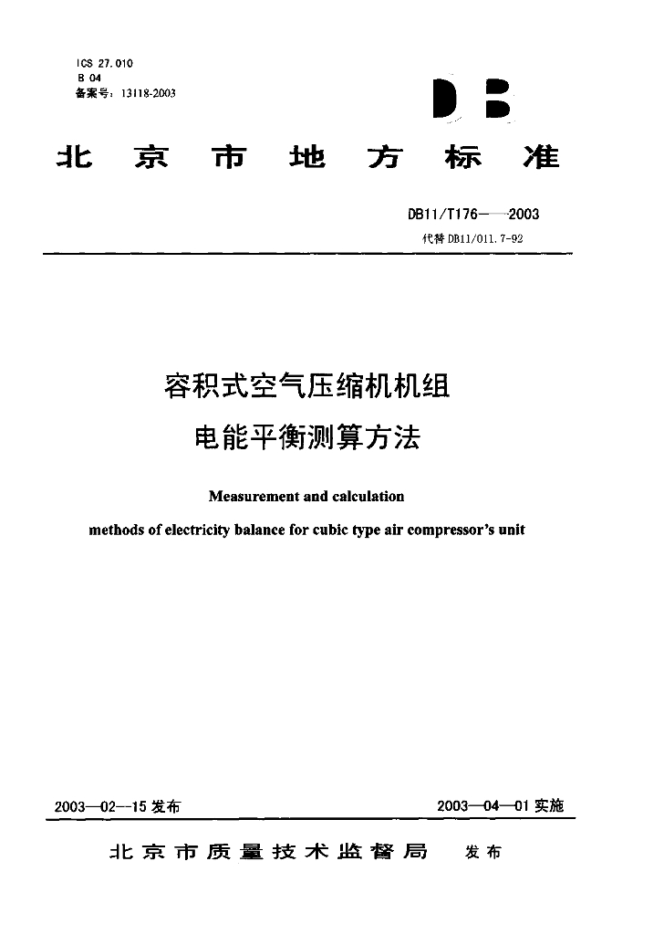 DB11/T 176-2003 容积式空气压缩机机组电能平衡测算方法