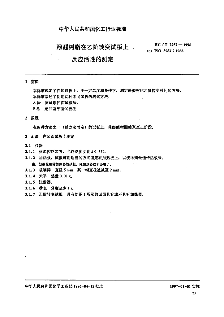 HG/T 2757-1996 酚醛树脂在乙阶转变试板上反应活性的测定