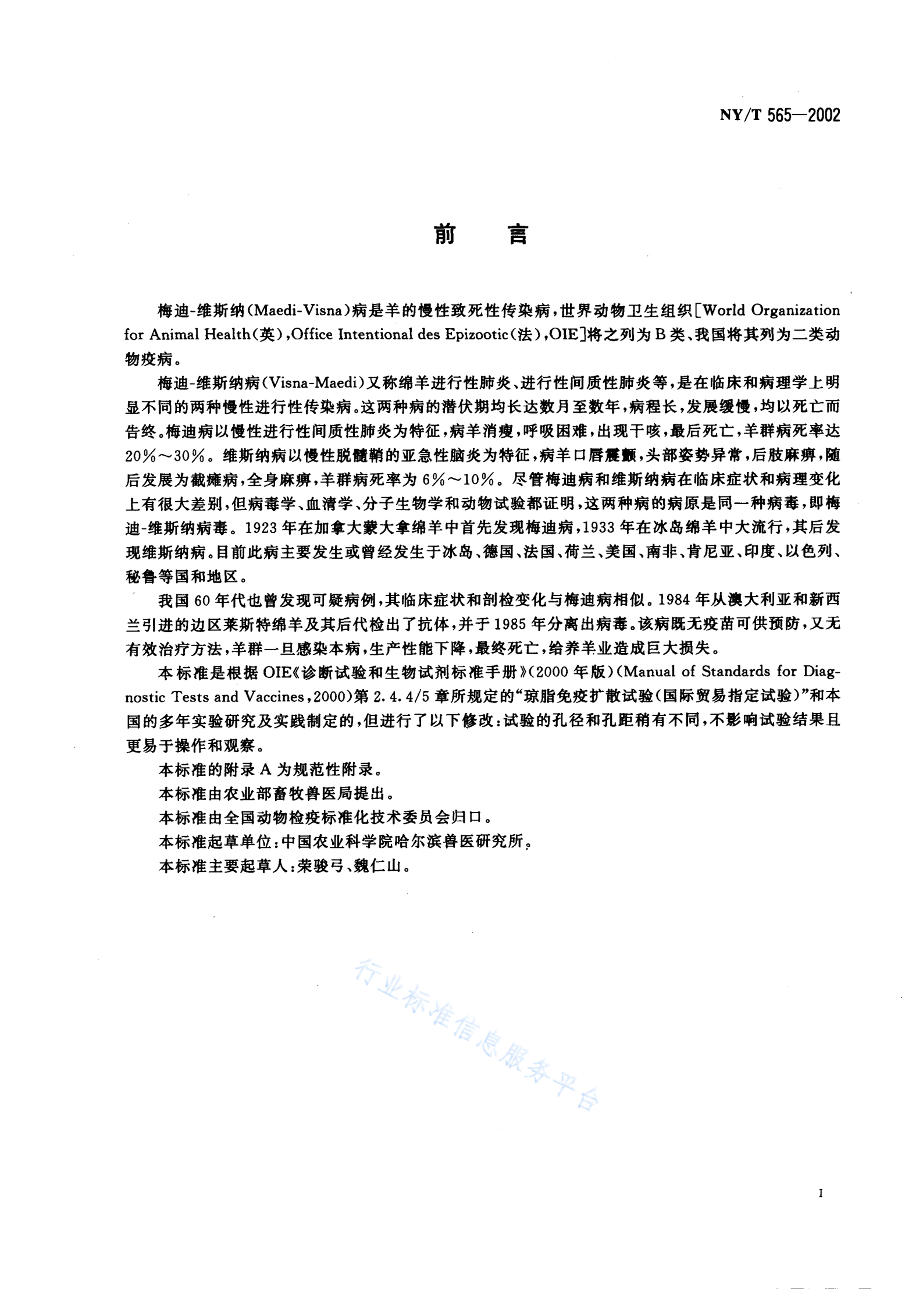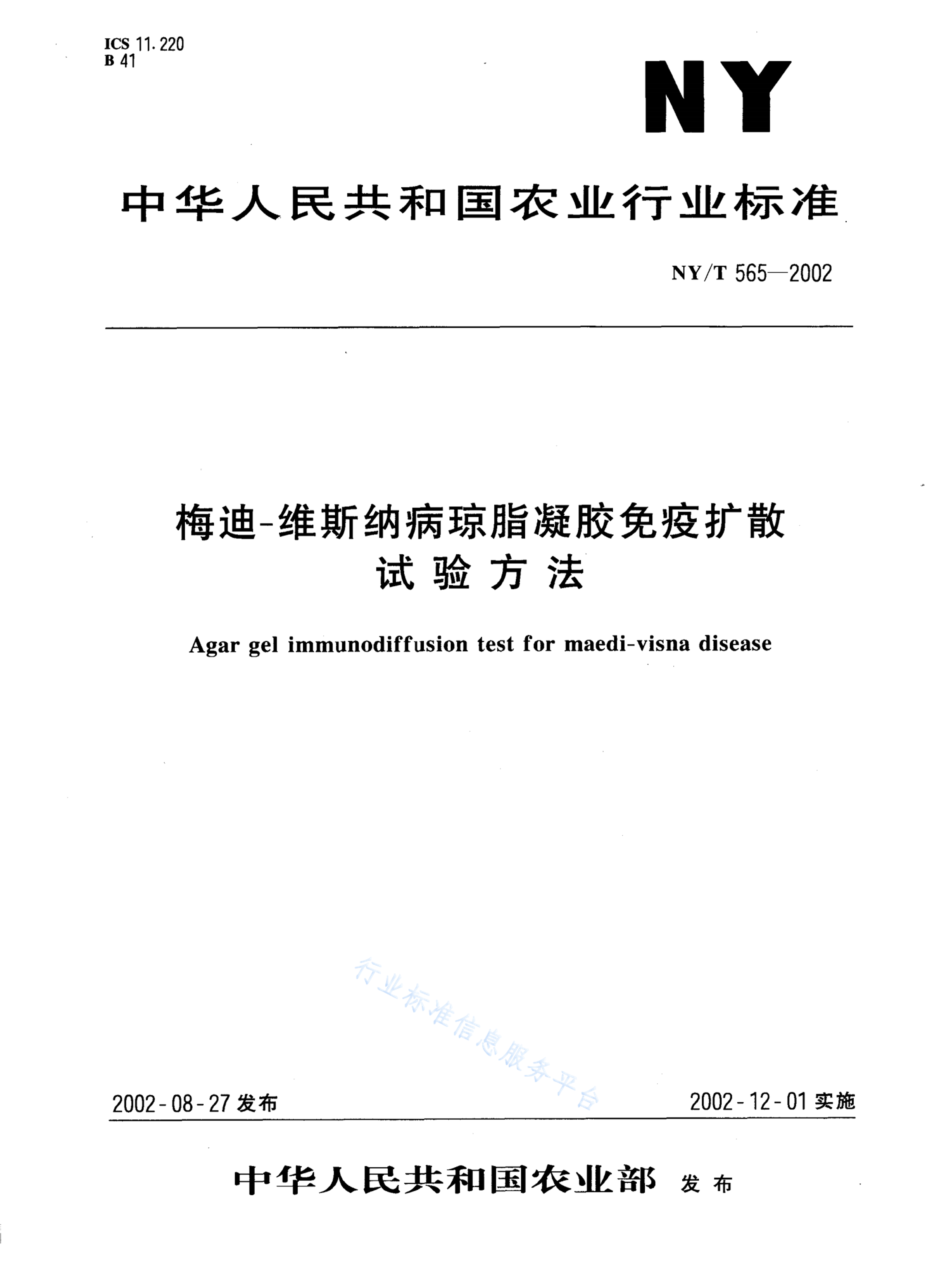 NY/T 565-2002 梅迪--维斯纳病琼脂凝胶免疫扩散试验方法