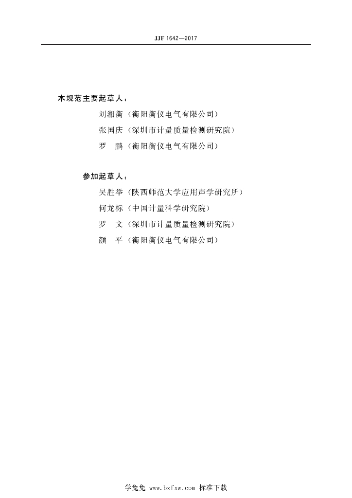 刘湘衡(衡阳衡仪电气有限公司)、张国庆(深圳市计量质量检测研究院)、罗鹏(衡阳衡仪电气有限公司)、吴胜举(陕西师范大学应用声学研究所)、何龙标(中国计量科学研究院)、罗文(深圳市计量质量检测研究院)、颜平(衡阳衡仪电气有限公司)