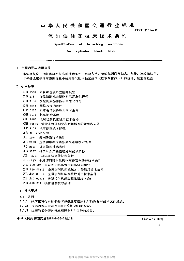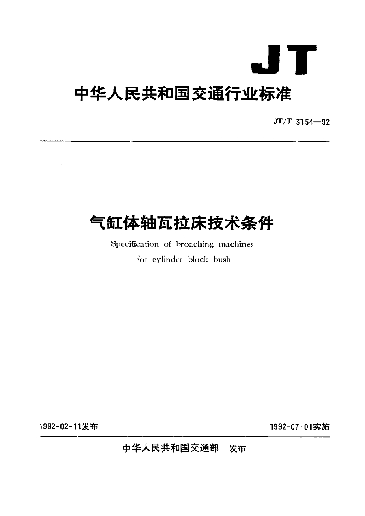 JT/T 3154-1992 气缸体轴瓦拉床技术条件