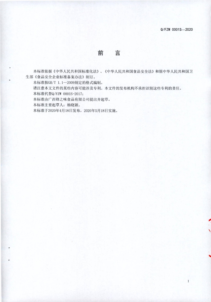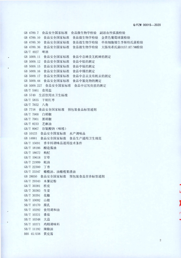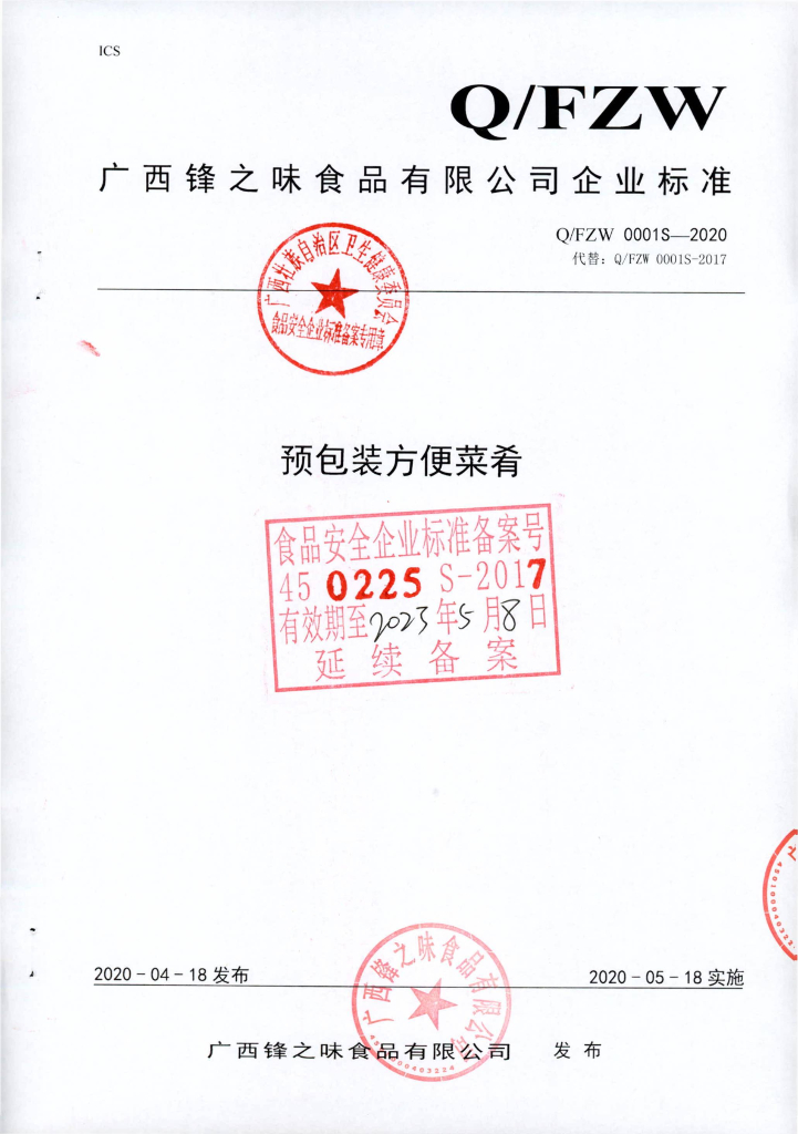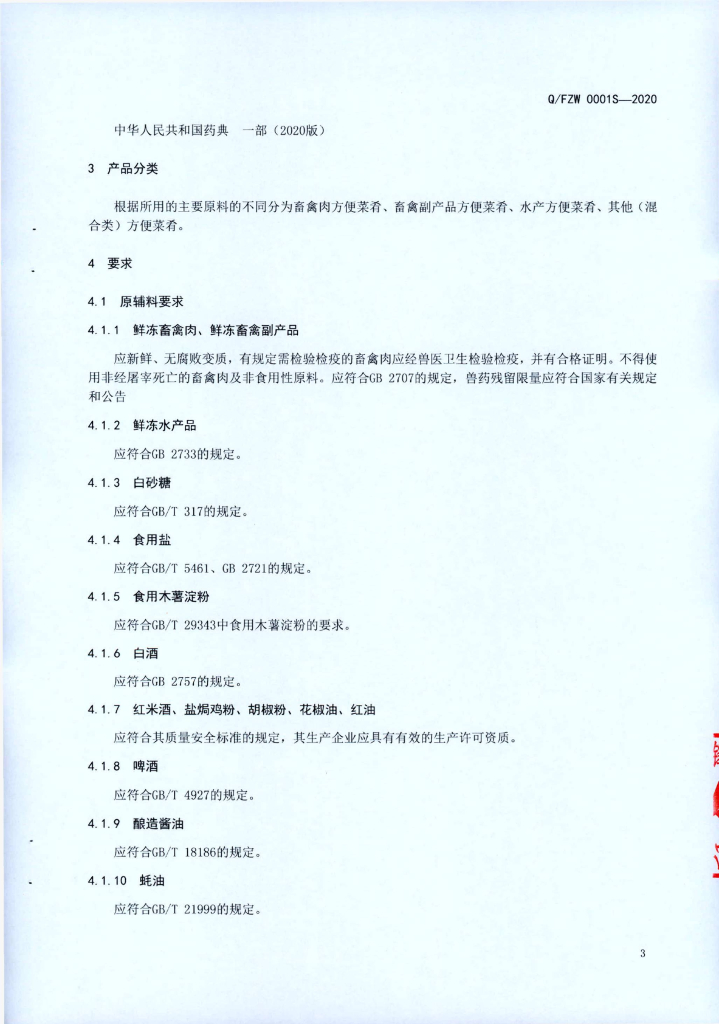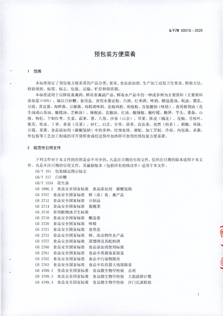 Q/FZW 0001S-2020 预包装方便菜肴