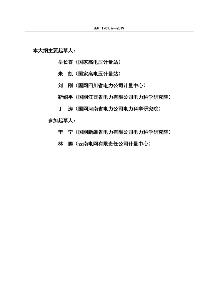 岳长喜(国家高电压计量站)、朱凯(国家高电压计量站)、刘刚(国网四川省电力公司计量中心)、靳绍平(国网江西省电力有限公司电力科学研究院)、丁涛(国网河南省电力公司电力科学研究院)、李宁(国网新疆省电力有限公司电力科学研究院)、林聪(云南电网有限责任公司计量中心)
