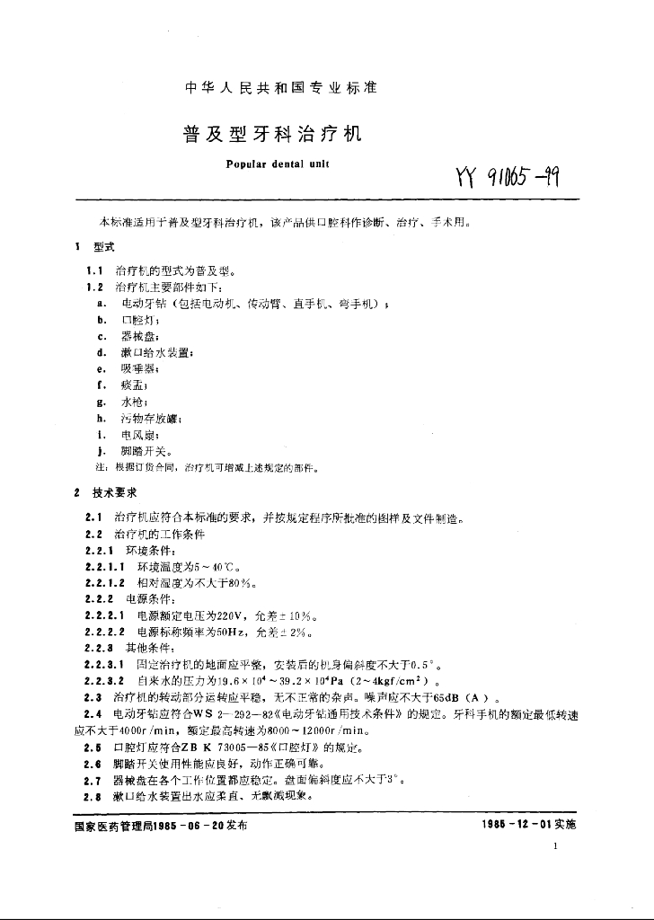 YY 91065-1999 普及型牙科治疗机 口腔灯