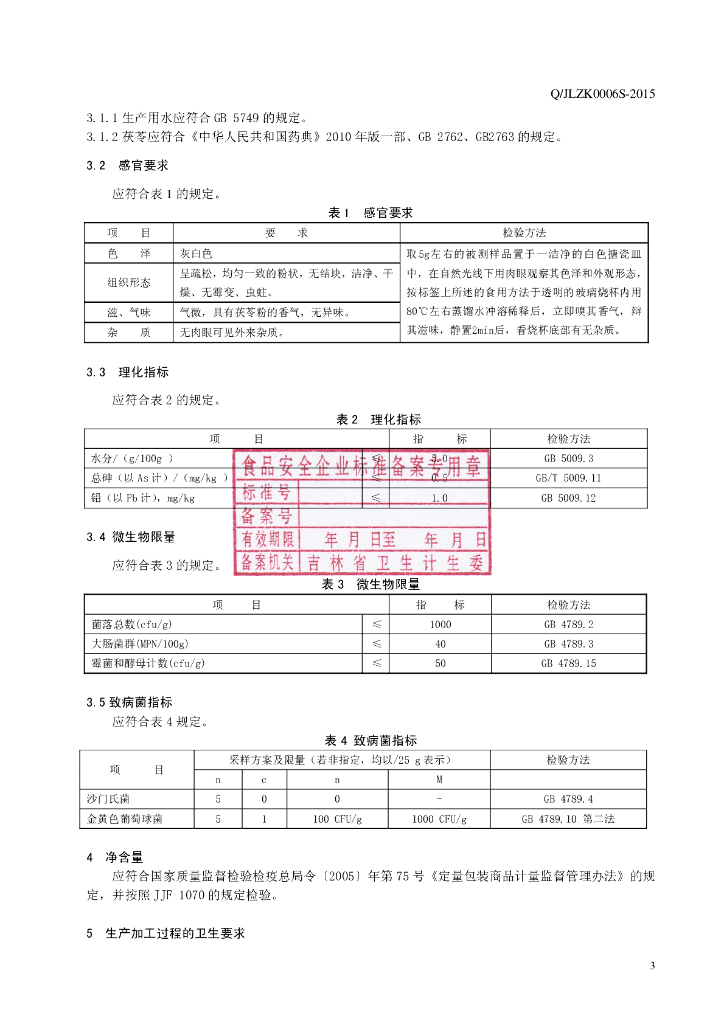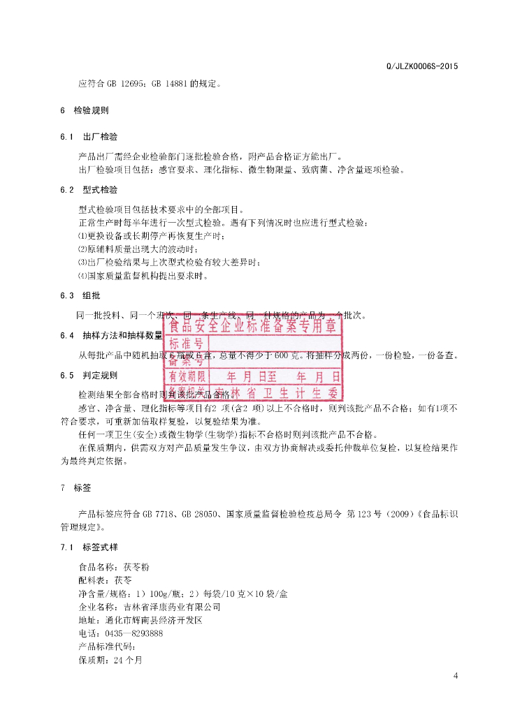 Q/JLZK 0006S-2015 吉林省泽康药业有限公司 茯苓粉