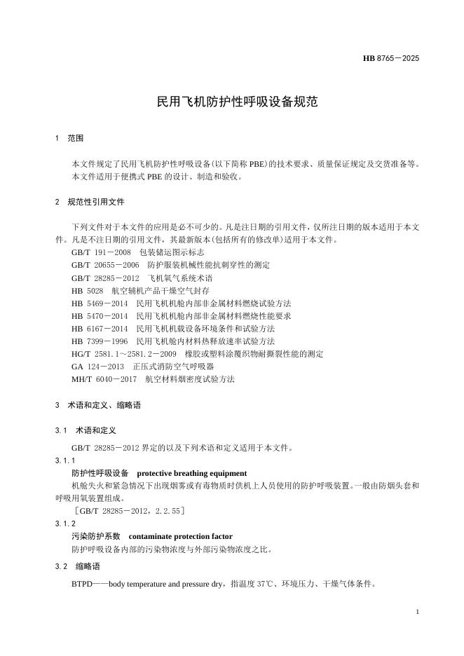 HB 8765-2025 民用飞机防护性呼吸设备规范