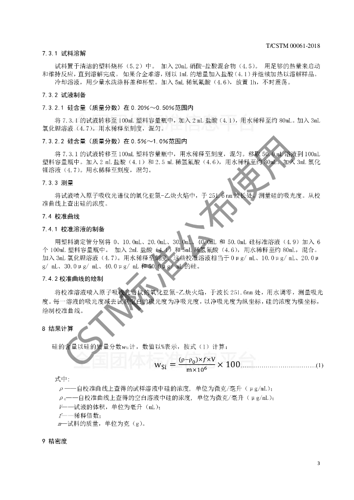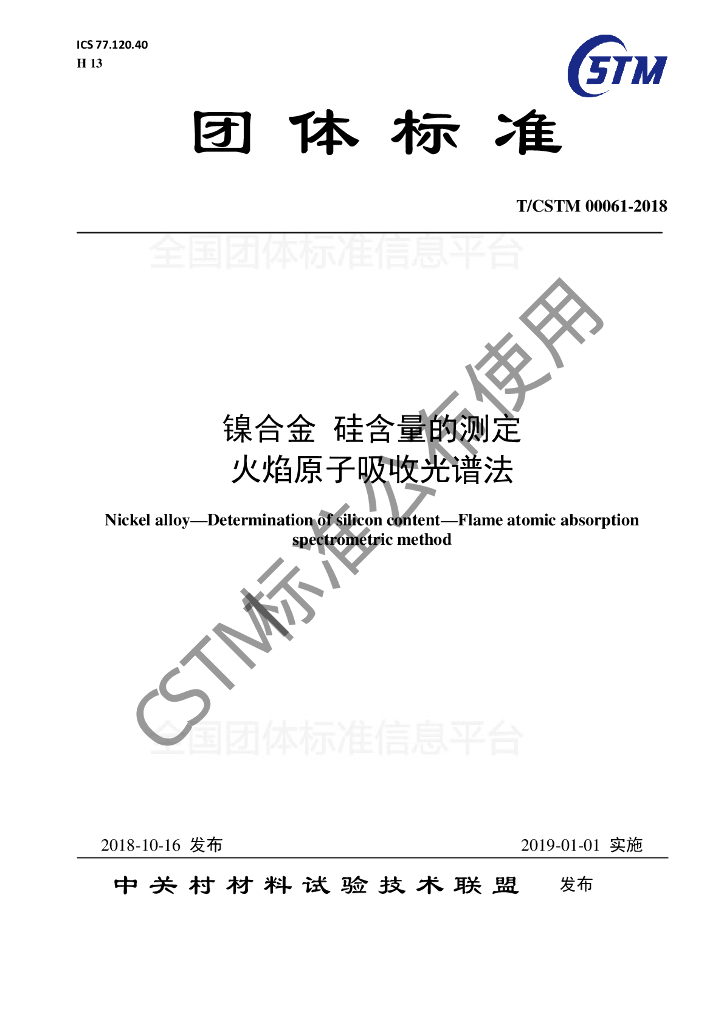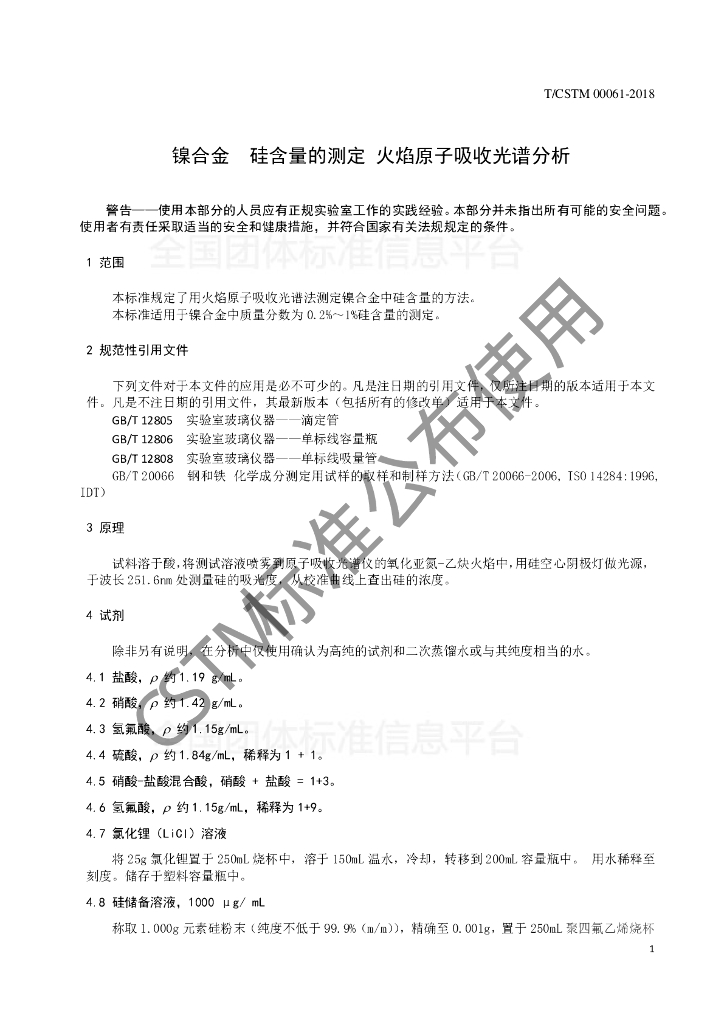 T/CSTM 00061-2018 镍合金 硅含量的测定 火焰原子吸收光谱法