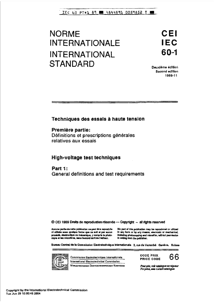 IEC 60060-1:1989 高压测试技术 第1部分:一般定义和测试要求