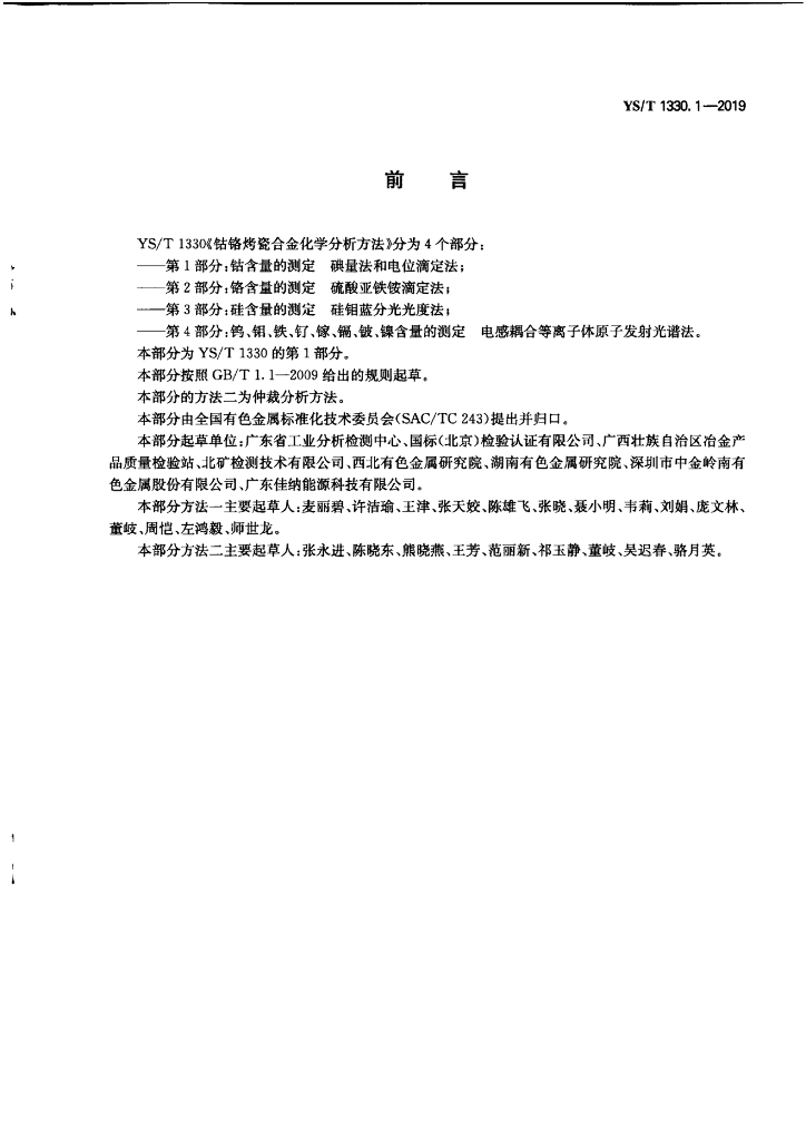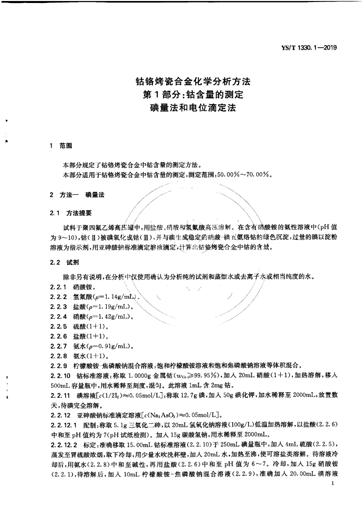 YS/T 1330.1-2019 钴铬烤瓷合金化学分析方法 第1部分:钴含量的测定 碘量法和电位滴定法