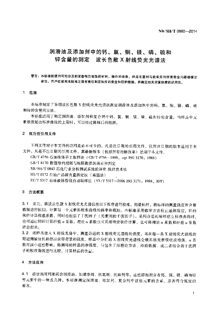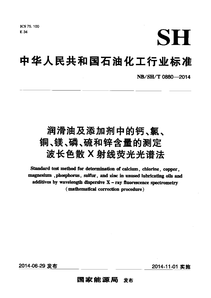 NB/SH/T 0880-2014 润滑油及添加剂中的钙、氯、铜、镁、磷、硫和锌含量的测定 波长色散X射线荧光光谱法