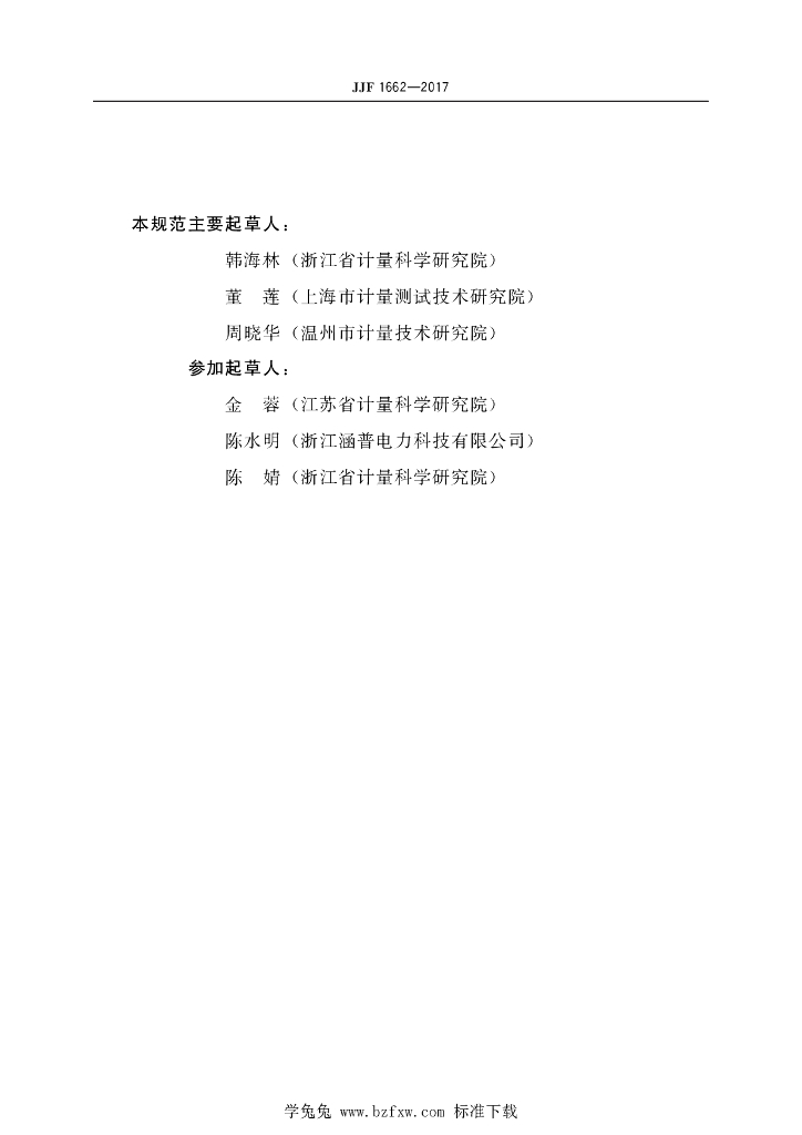 韩海林(浙江省计量科学研究院)、董莲(上海市计量测试技术研究院) 、周晓华(温州市计量技术研究院)、金蓉(江苏省计量科学研究院)、陈水明(浙江涵普电力科技有限公司) 、陈蜻(浙江省计量科学研究院)