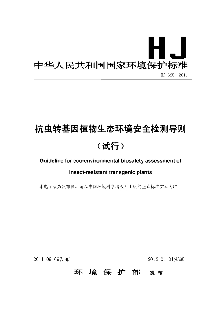 HJ 625-2011 抗虫转基因植物生态环境安全检测导则(试行)