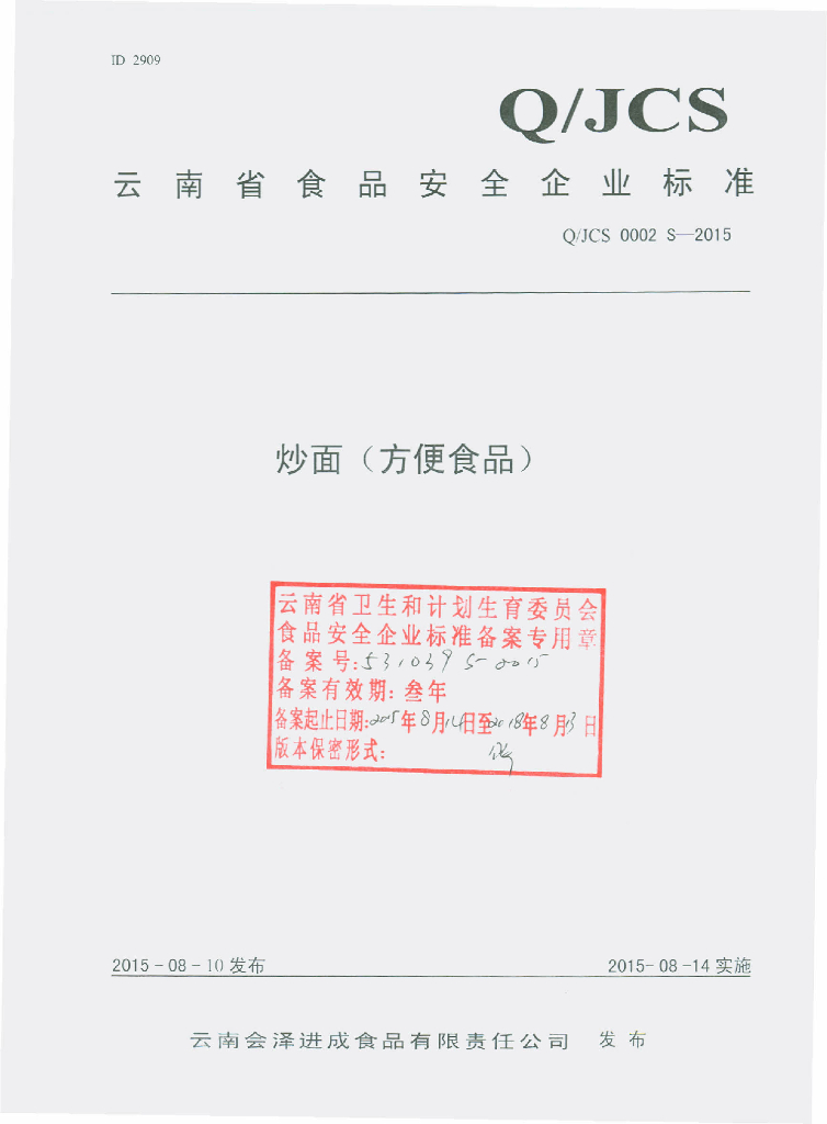 Q/JCS 0002S-2015 云南会泽进成食品有限责任公司 炒面(方便食品)