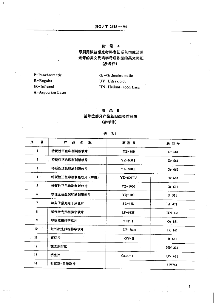 HG/T 2618-1994 印刷用感光材料型号编排原则 第一部分 银盐感光材料
