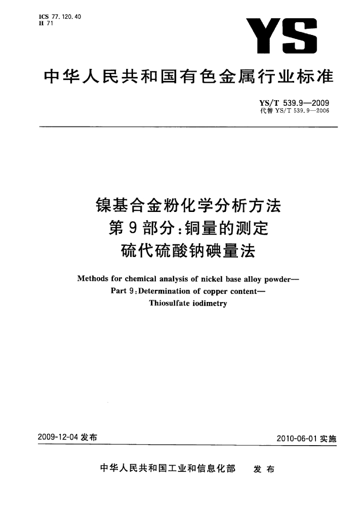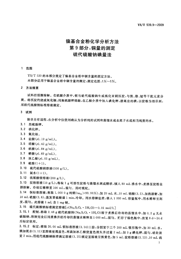 YS/T 539.9-2009 镍基合金粉化学分析方法 第9部分:铜量的测定硫代硫酸钠碘量法